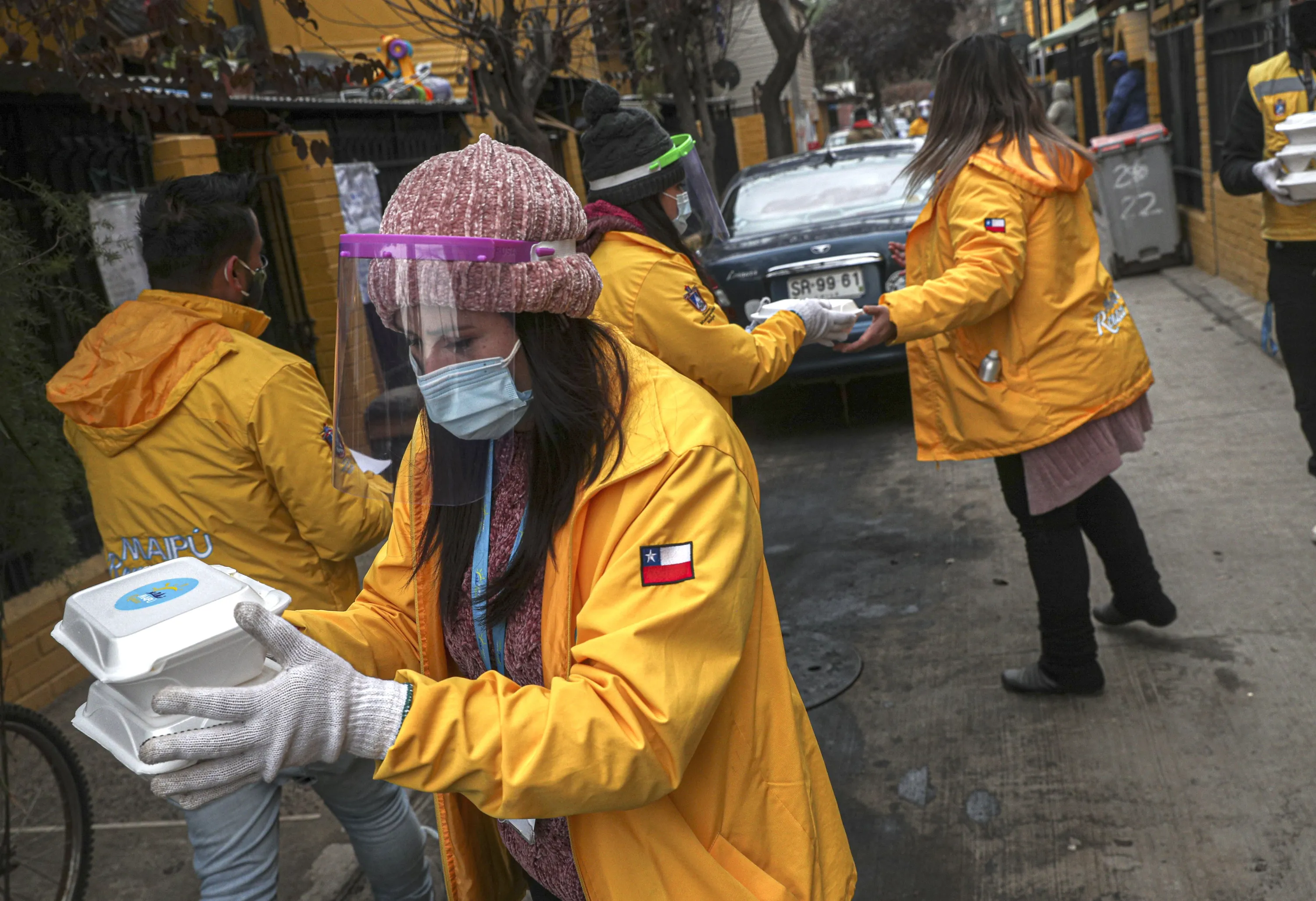 City workers deliver food preparared by an army kitchen for people who are facing hardship because of lost income due to the new coronavirus pandemic, in Maipu, on the outskirts of Santiago, Chile, Tuesday, June 16, 2020. (Photo by Esteban Felix/AP Photo)