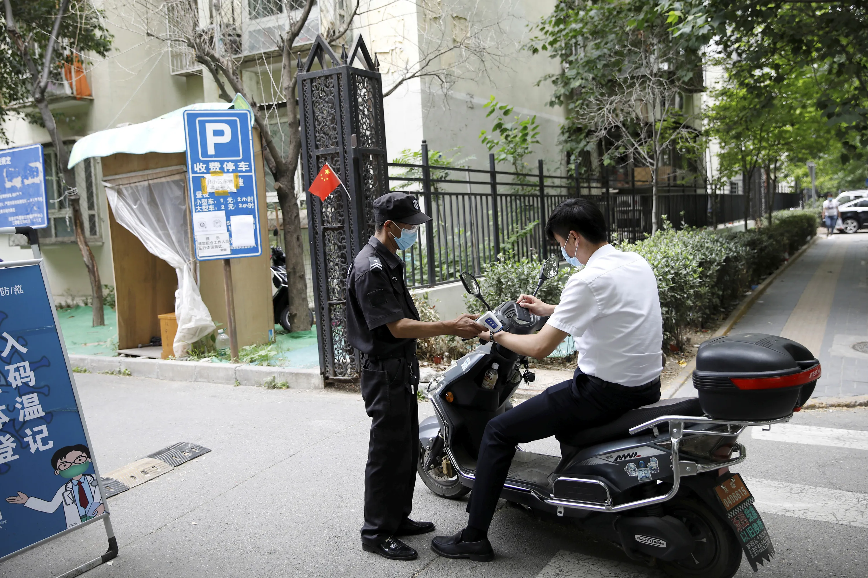 A security guard takes body temperature measurement of a man at an entrance to a residential compound following new cases of coronavirus disease (COVID-19) infections in Beijing, China on June 17, 2020. (Photo by Carlos Garcia Rawlins/Reuters)
