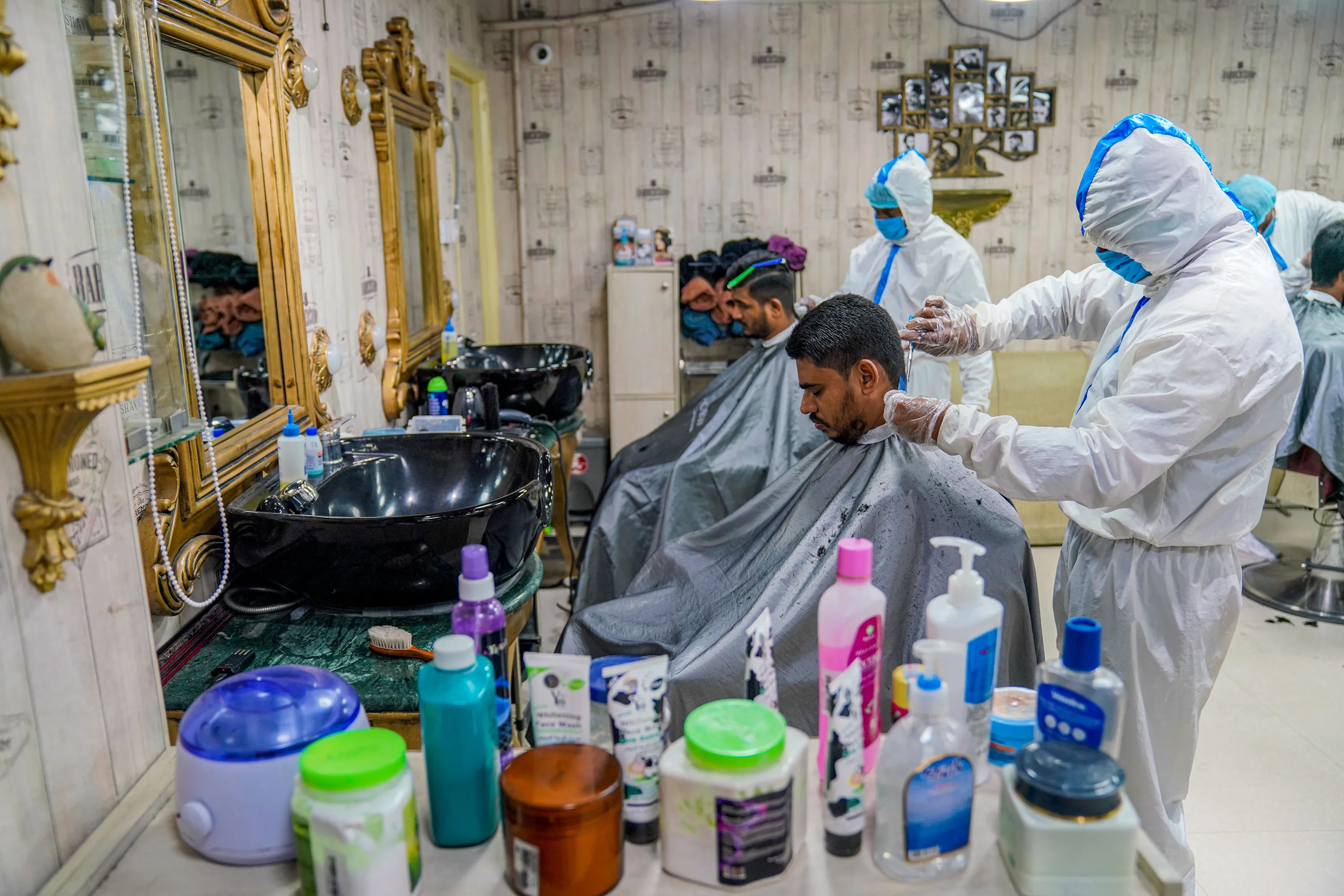 Salon staff reinforce protection measures during the coronavirus (COVID-19) disease pandemic in Dhaka, Bangladesh on June 16, 2020. (Photo by Zabed Hasnain Chowdhury/SOPA Images/Rex Features/Shutterstock)