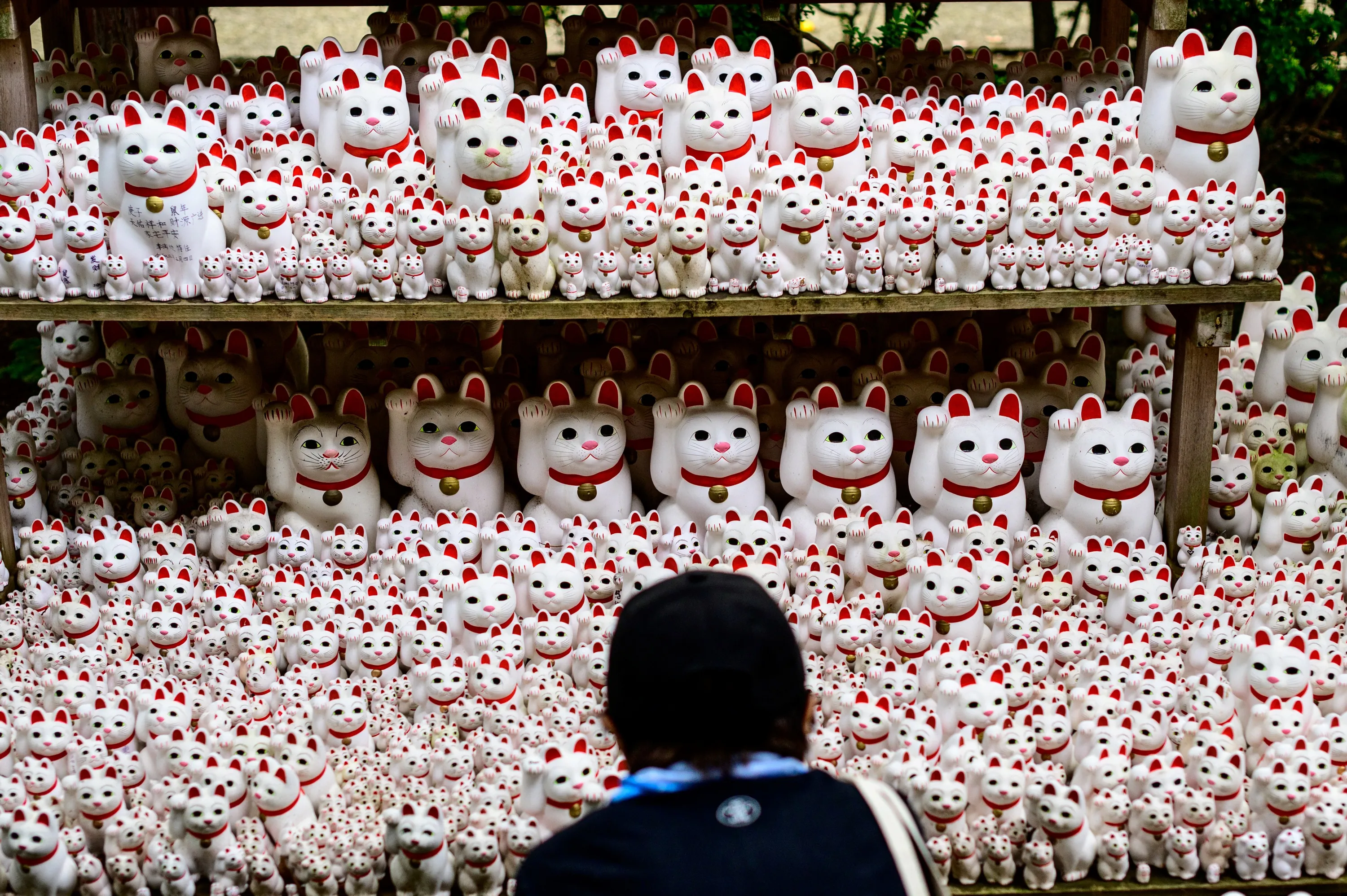 A visitor takes pictures of Maneki statues, also known as beckoning cat, at G?tokuji temple in Tokyo on June 10, 2020. (Photo by Philip Fong/AFP Photo)
