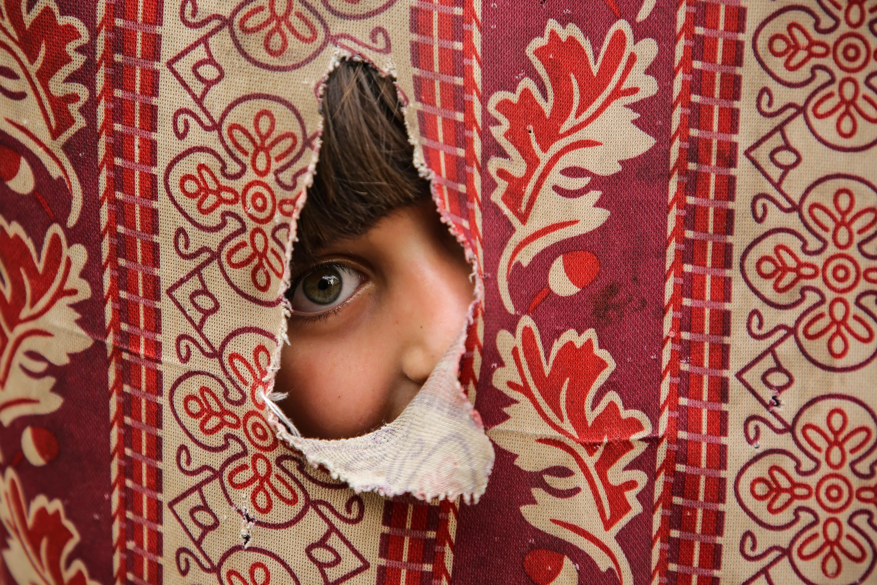 A Palestinian child looks through a hole in a blanket in the Shati refugee camp in Gaza City, June 7, 2020. (Photo by Chine Nouvelle/SIPA Press/Rex Features/Shutterstock)