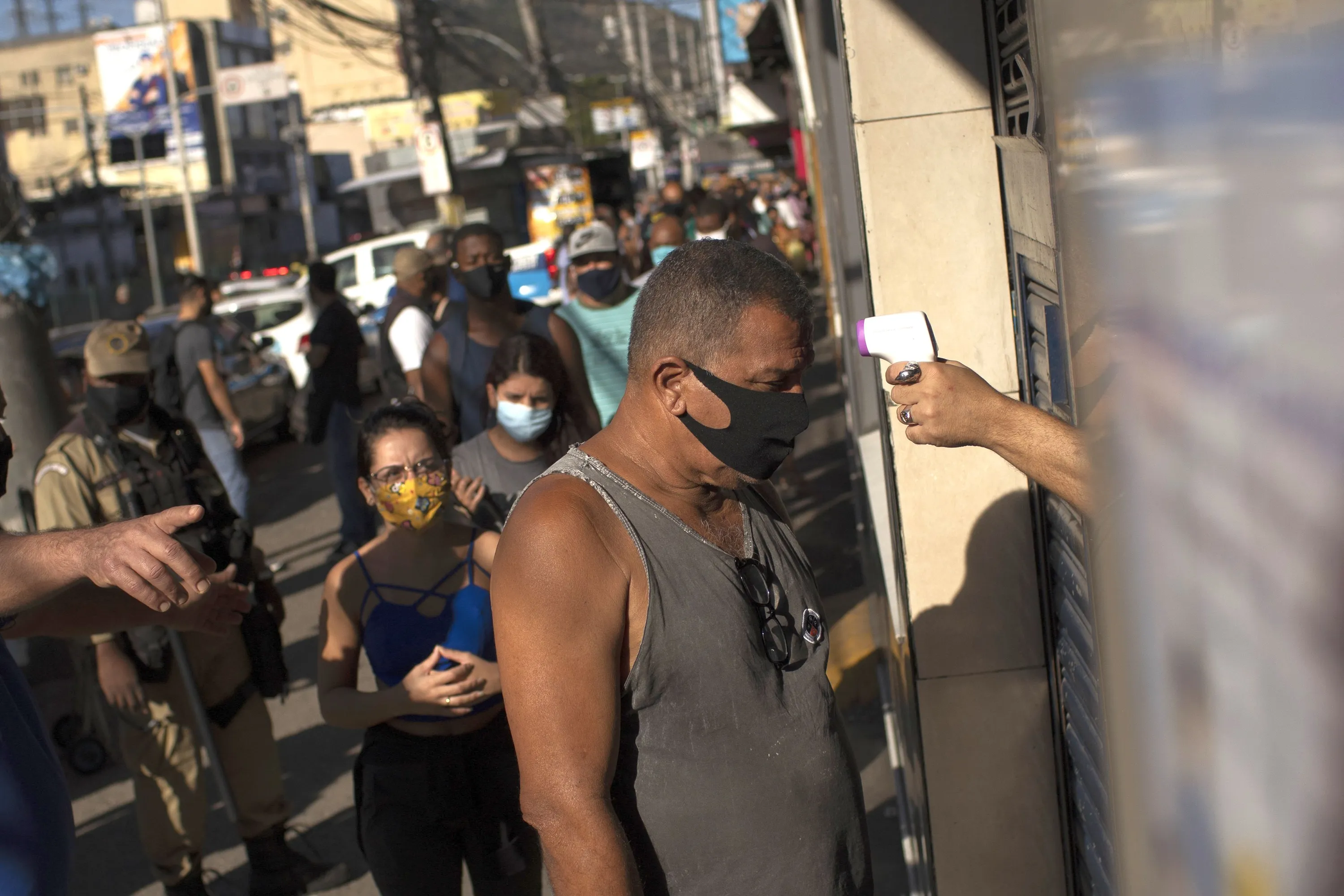 A man gets his temperature checked before entering the Madureira market amid the new coronavirus pandemic in Rio de Janeiro, Brazil, Wednesday, June 17, 2020. Rio continues with its plan to ease restrictive measures and open the economy to avoid an even worse economic crisis. (Photo by Silvia Izquierdo/AP Photo)