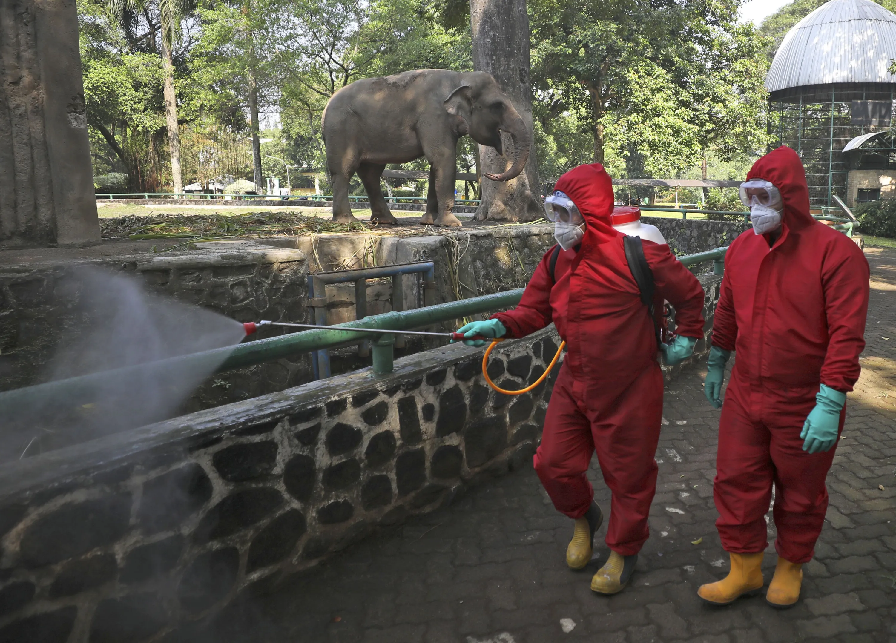 Indonesian firefighters spray disinfectant at the public area near an elephant enclosure at Ragunan Zoo prior to its reopening this weekend after weeks of closure due to the large-scale restrictions imposed to help curb the new coronavirus outbreak, in Jakarta, Indonesia, Wednesday, June 17, 2020. As Indonesia's overall virus caseload continues to rise, the capital city has moved to restore normalcy by lifting some restrictions, saying that the spread of the virus in the city of 11 million has slowed after peaking in mid-April. (Photo by Dita Alangkara/AP Photo)