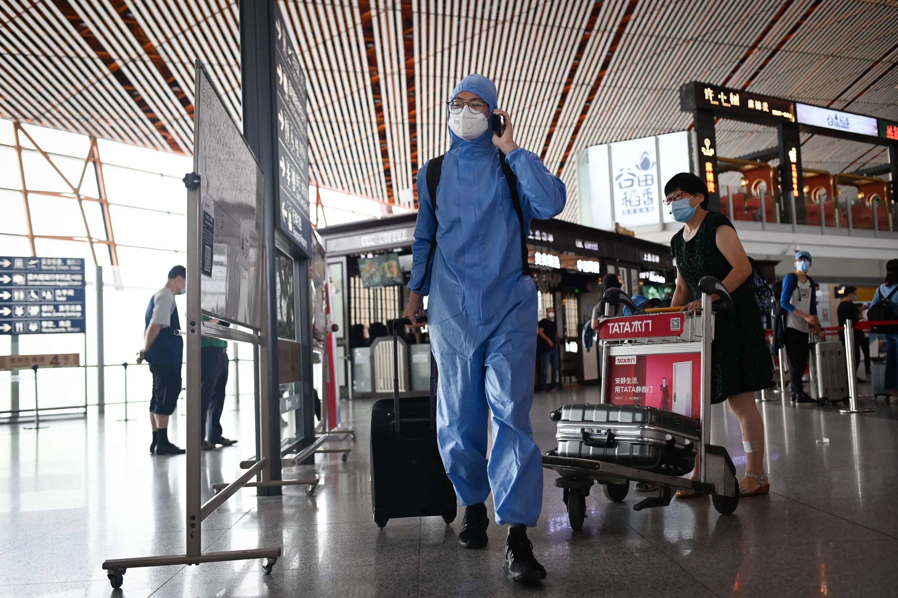 A man wearing a protective suit uses his phone at Beijing's international airport on June 17, 2020. Beijing's airports cancelled more than 1,200 flights and schools in the Chinese capital were closed again on June 17 as authorities rushed to contain a new coronavirus outbreak linked to a wholesale food market. (Photo by AFP Photo/China Stringer Network)