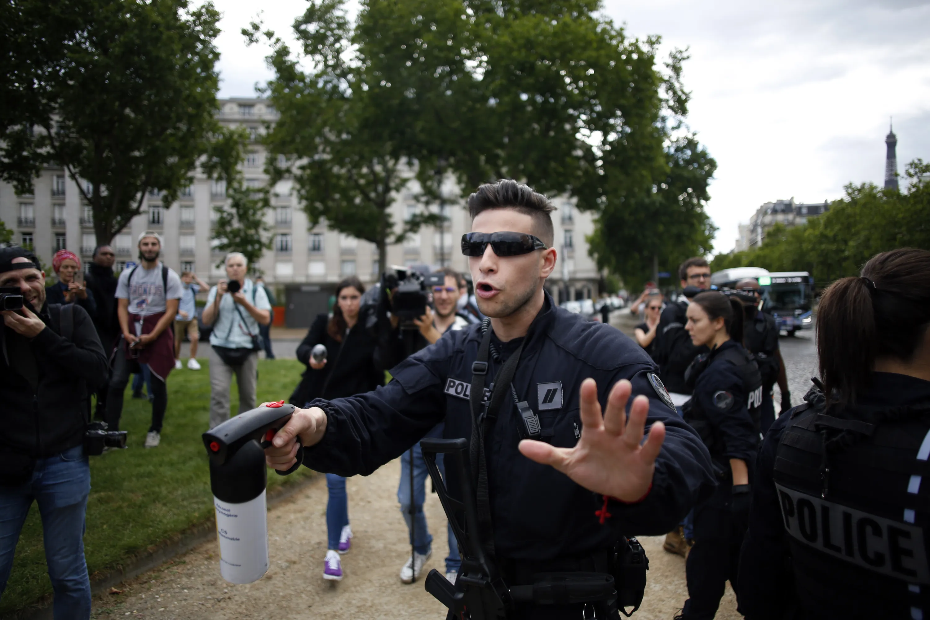 A police officer keeps people at a distance while anticolonial activist cover French military commander Joseph Gallieni statue with a black cloth, in Paris, Thursday, June 18, 2020. Gallieni began a colonial career at the end of the 19th century and later played an important role during First World War as a military governor of Paris. Gallieni used brutal methods to quell rebellion of local populations in French colonies, including as a governor of Madagascar where he abolished the 350-year-old monarchy on the island. (Photo by Thibault Camus/AP Photo)