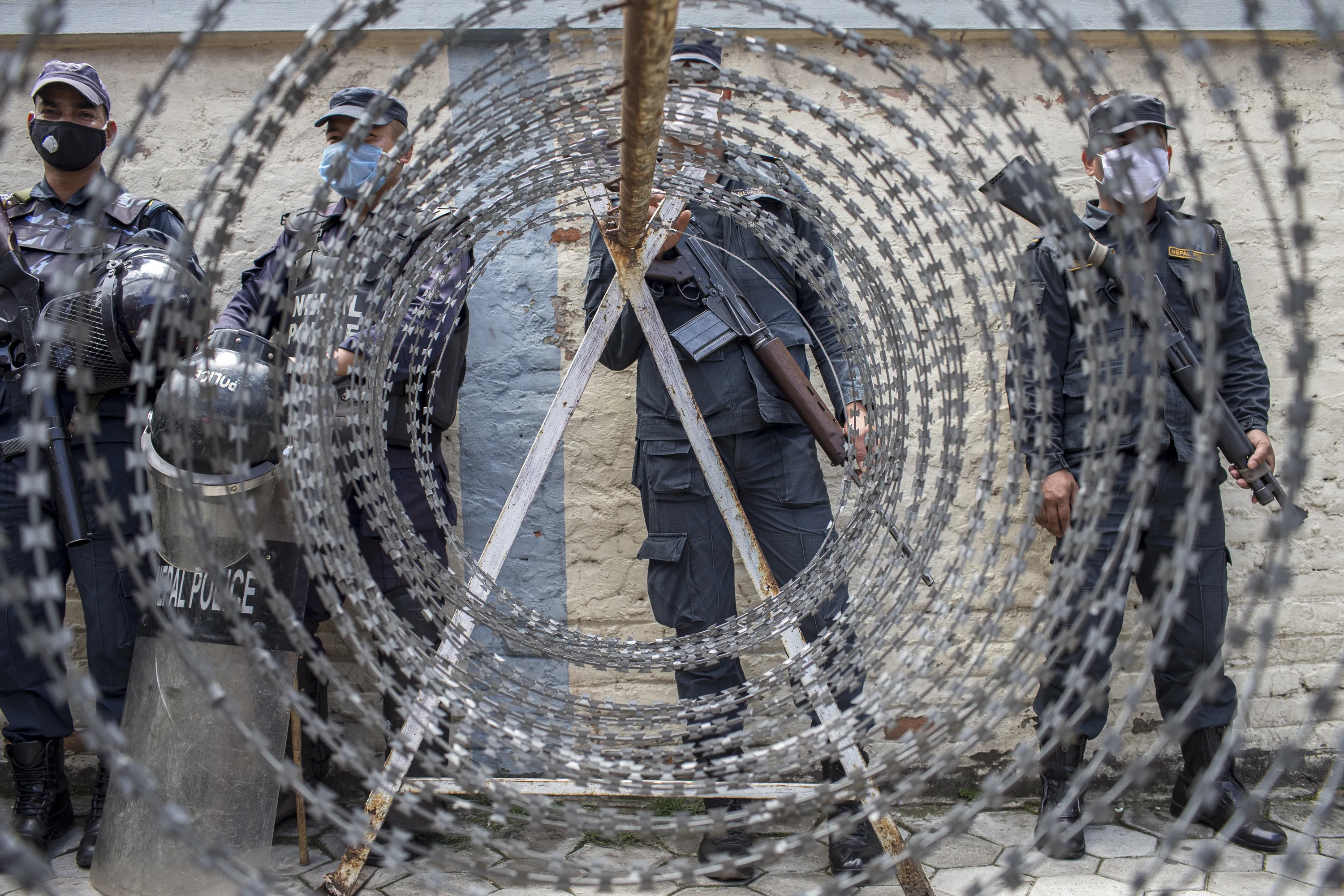 Nepalese police stand guard as activists affiliated with Human Rights and Peace Society Nepal protest in Kathmandu, Nepal, 18 June 2020. A group of activists staged sit in protest in Kathmandu calling for peaceful solution over the border dispute. According to media reports, twenty Indian Army personnel including a colonel were killed in the clash with Chinese troops in Galwan Valley of the eastern Ladakh region. (Photo by Narendra Shrestha/EPA/EFE)