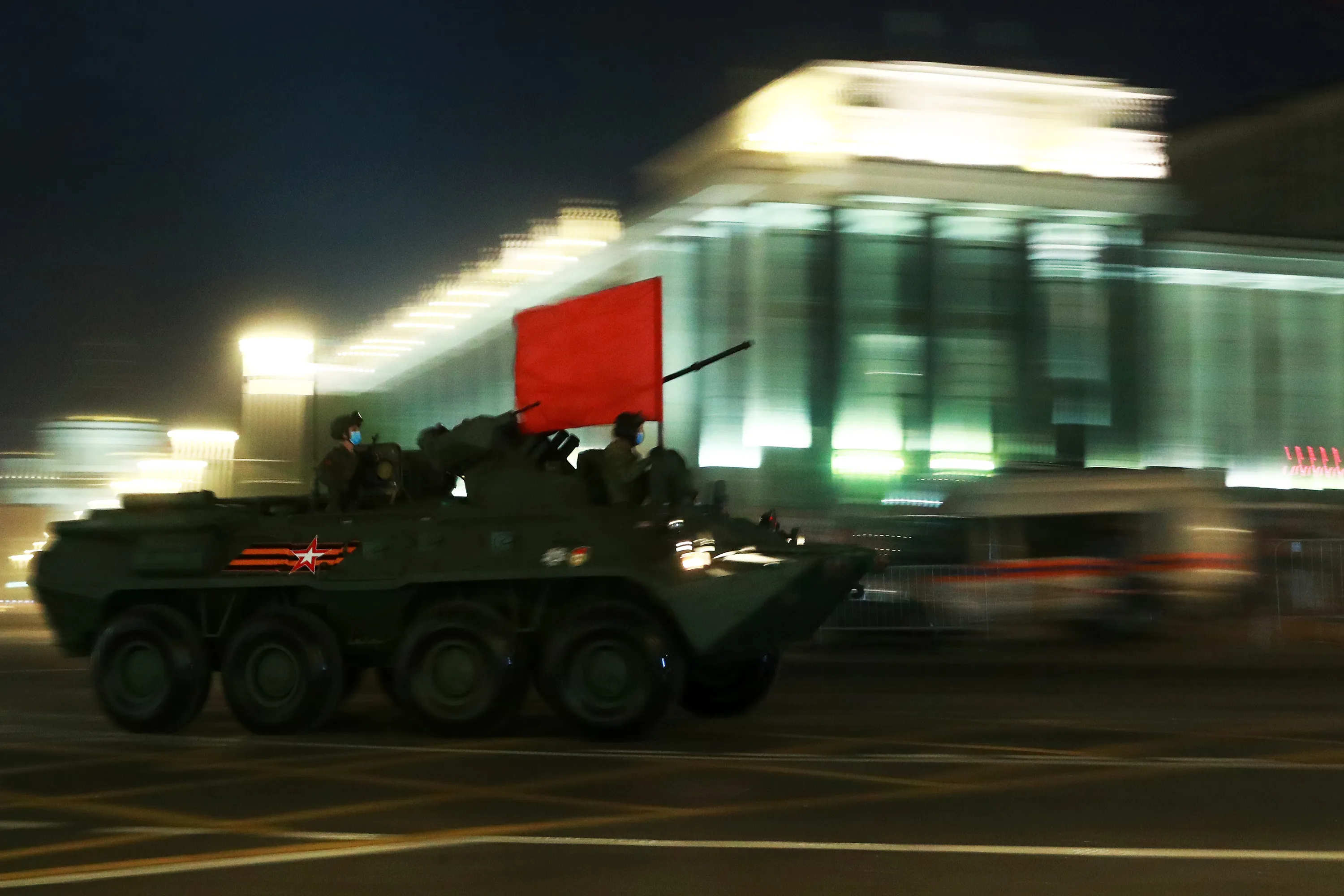 A BTR-82A armored personnel carrier moves in central Moscow on June 17, 2020 during a rehearsal of a military parade in Red Square marking the 75th anniversary of the victory over Nazi Germany in World War II. Victory Day parades across Russia have been postponed from May 9 to June 24 due to lockdown restrictions imposed amid the coronavirus pandemic. (Photo by Sergei Fadeichev/TASS)
