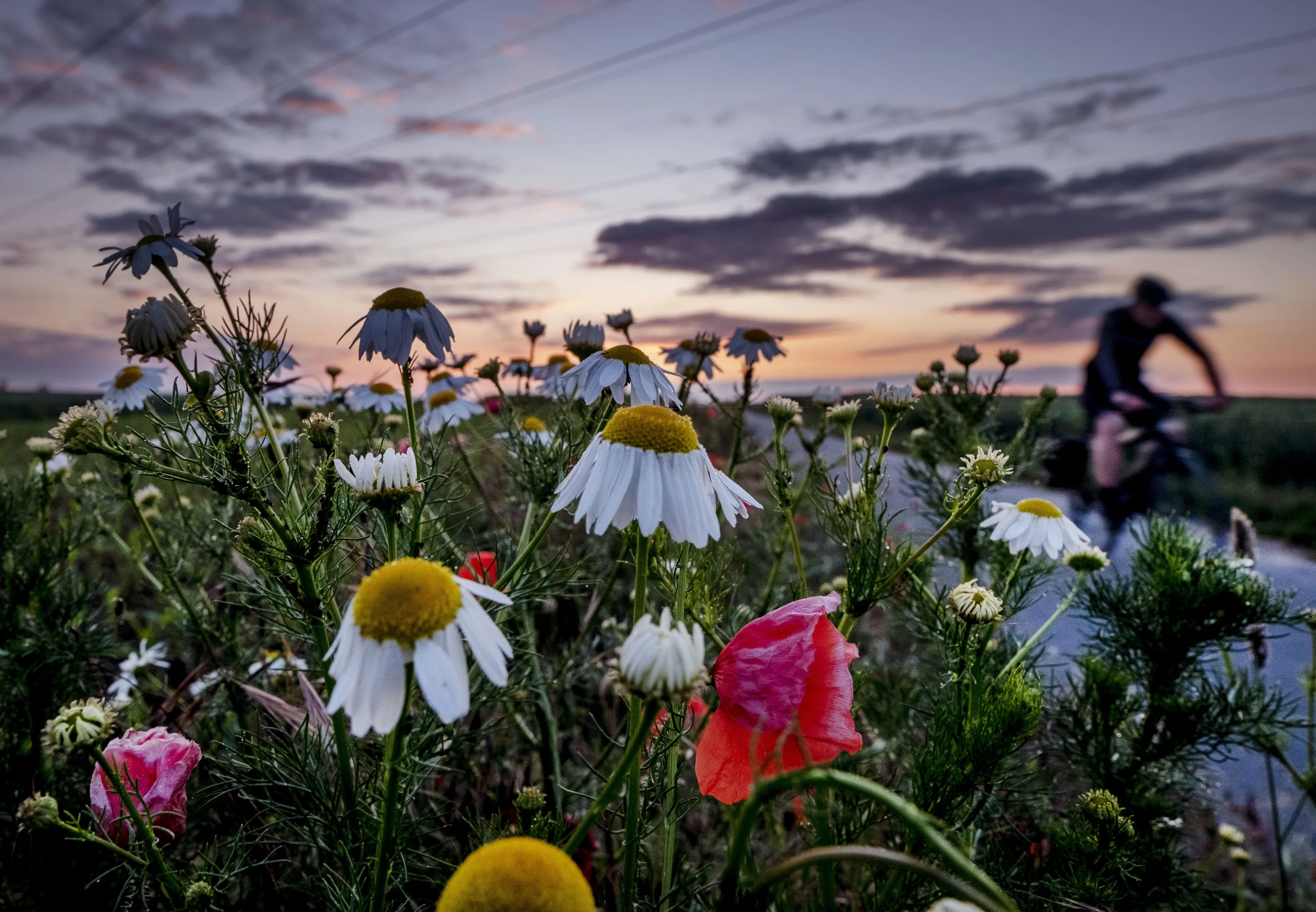 A man rides his bike along flowers on a small road on the outskirts of Frankfurt, Germany, early Monday, June 8, 2020. (Photo by Michael Probst/AP Photo)
