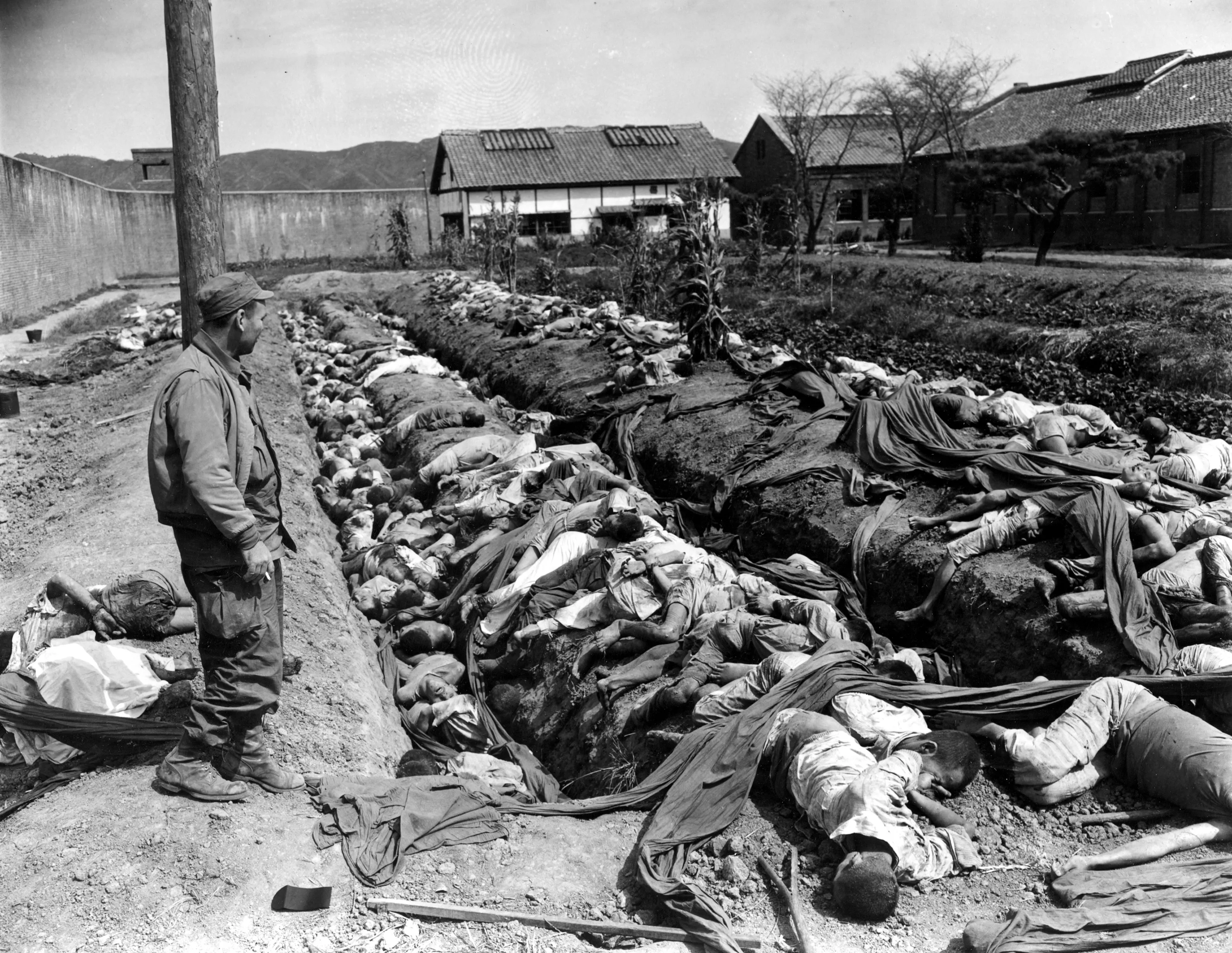 Bodies of some 400 Korean civilians lie in and around trenches in Taejon's prison yard during the Korean War, Sept. 28, 1950. The victims were bound and slain by retreating Communist forces before the 24th U.S. Division troops recaptured the city Sept. 28. Witnesses said that the prisoners were forced to dig their own trench graves before the slaughter. Looking on, at left, is Gordon Gammack, war correspondent of the Des Moines Register and Tribune. (Photo by James Pringle/AP Photo)