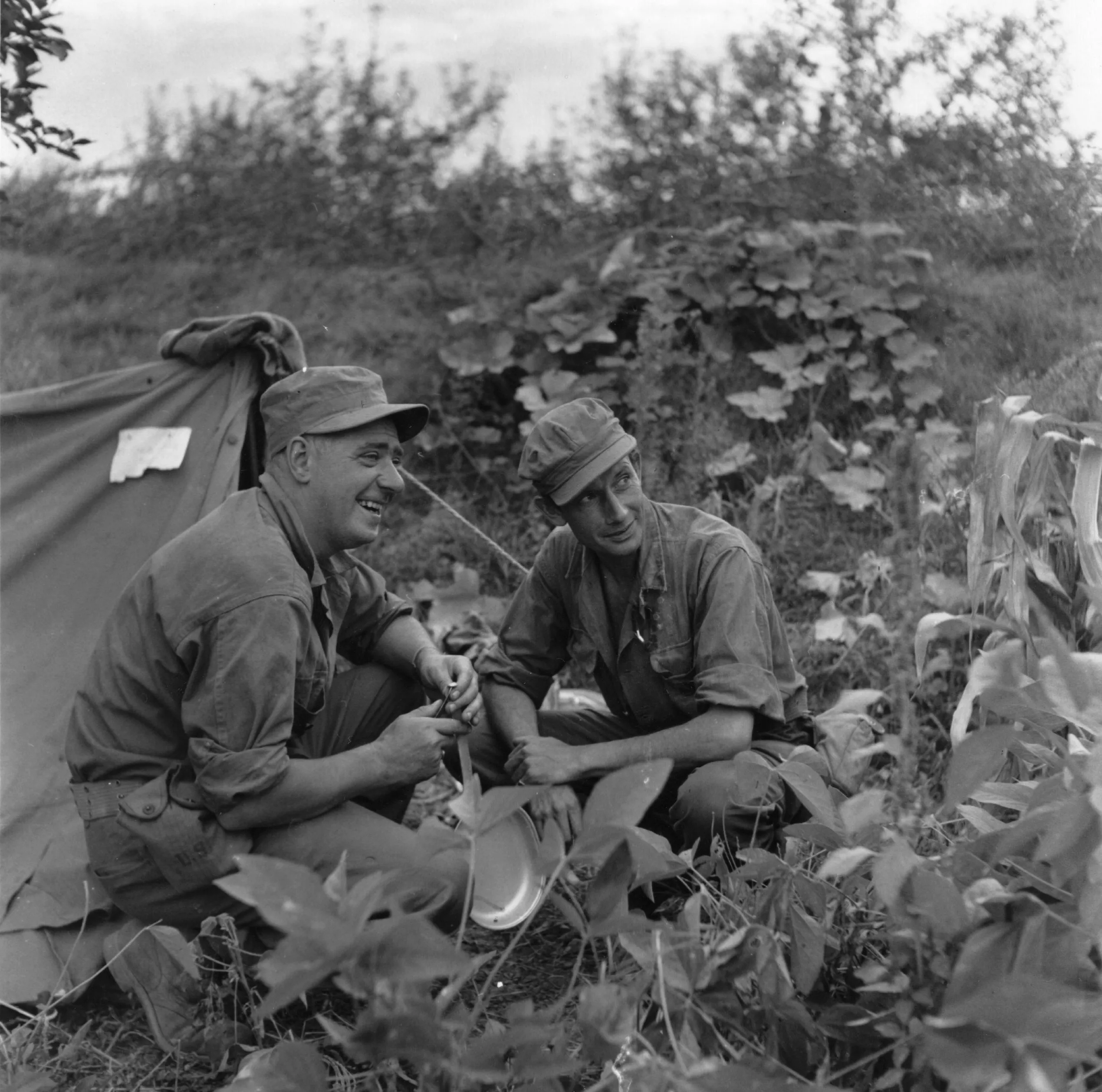 Picture Post photographer Bert Hardy, with journalist James Cameron, covering front line troop movements during the Korean War, 1950. (Photo by Bert Hardy/Getty Images)