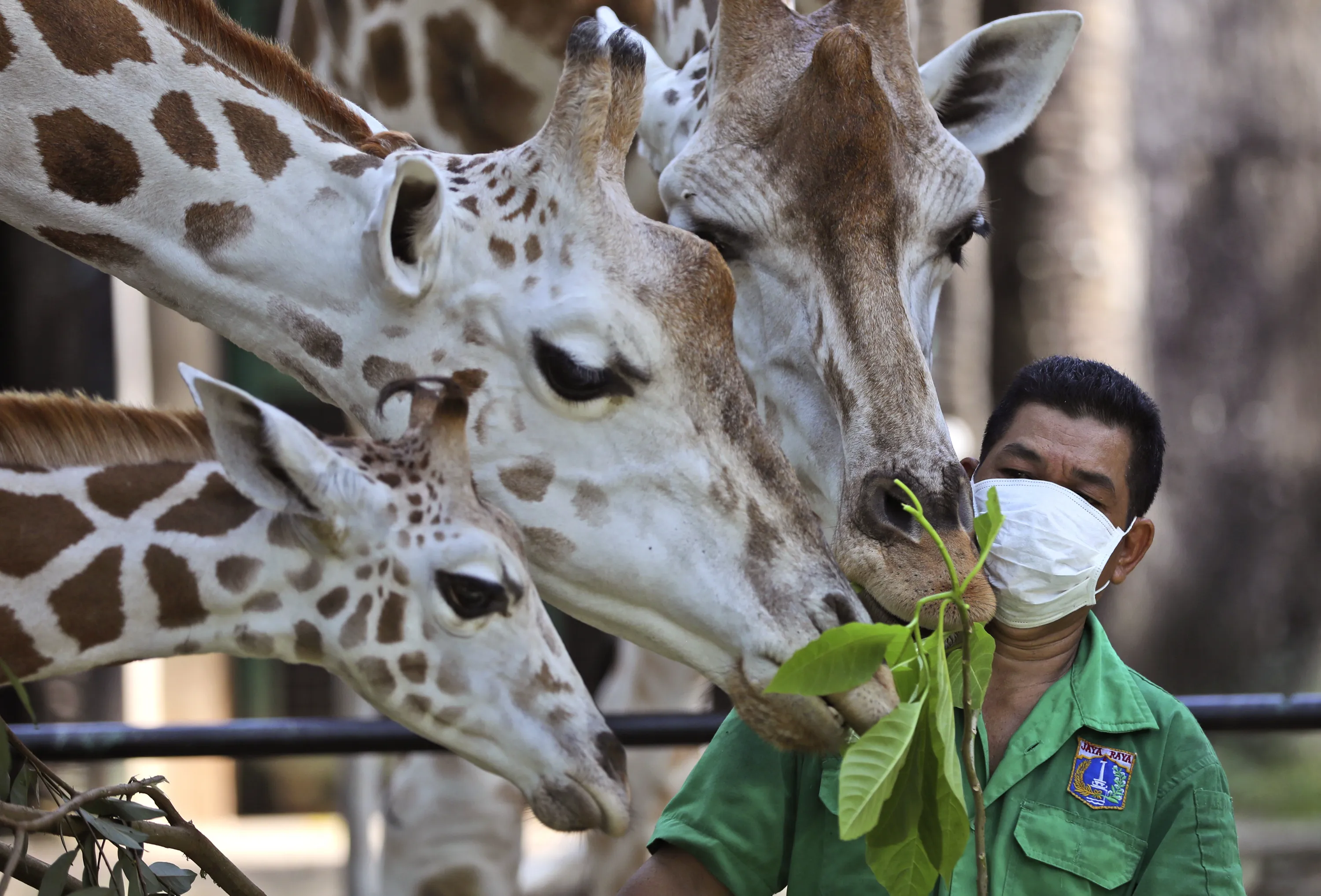 A keeper wearing protective face mask feeds giraffes at Ragunan Zoo prior to its reopening this weekend after weeks of closure due to the large-scale restrictions imposed to help curb the new coronavirus outbreak, in Jakarta, Indonesia, Wednesday, June 17, 2020. As Indonesia's overall virus caseload continues to rise, the capital city has moved to restore normalcy by lifting some restrictions, saying that the spread of the virus in the city of 11 million has slowed after peaking in mid-April. (Photo by Dita Alangkara/AP Photo)