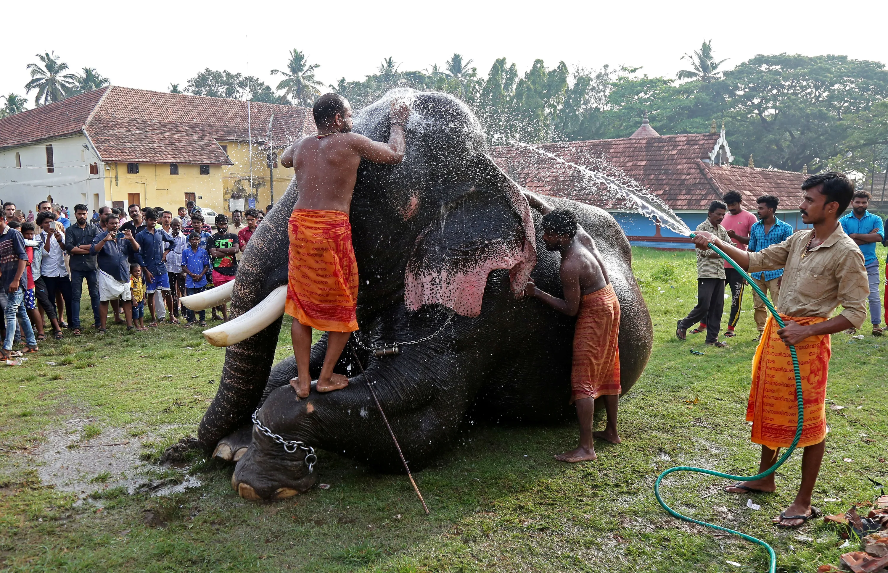Mahouts bathe an elephant at a temple on the outskirts of Kochi, India, March 27, 2018. (Photo by Sivaram V/Reuters)