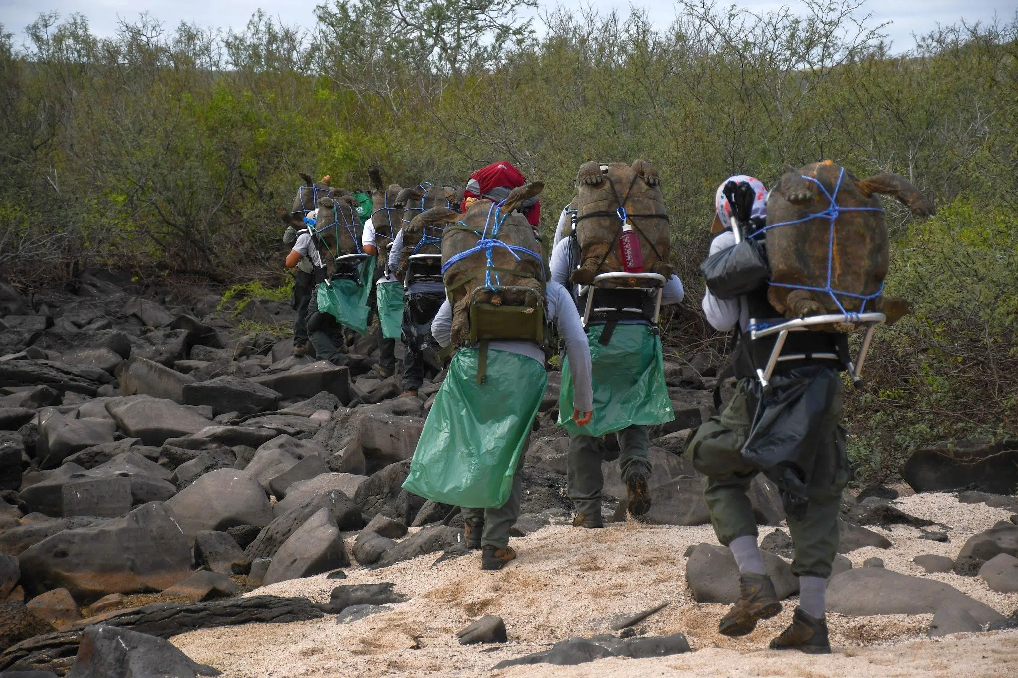 In this handout picture released by Parque Nacional Galapagos (Galapagos National Park), park rangers move chelonidis hoodensis turtles before being released in the area called Las Tunas, 2.5 km from the coast of Espanola Island in the Galapagos archipelago, Ecuador, on June 15, 2020. Diego, an over 100 years-old giant tortoise considered a super male by saving his species from extinction in the Ecuadorian Galapagos archipelago, was returned to his native island Espanola after breeding in captivity for several decades, Environment Minister Paulo Proano, reported Monday. (Photo by Parque Nacional Galápagos/AFP Photo)