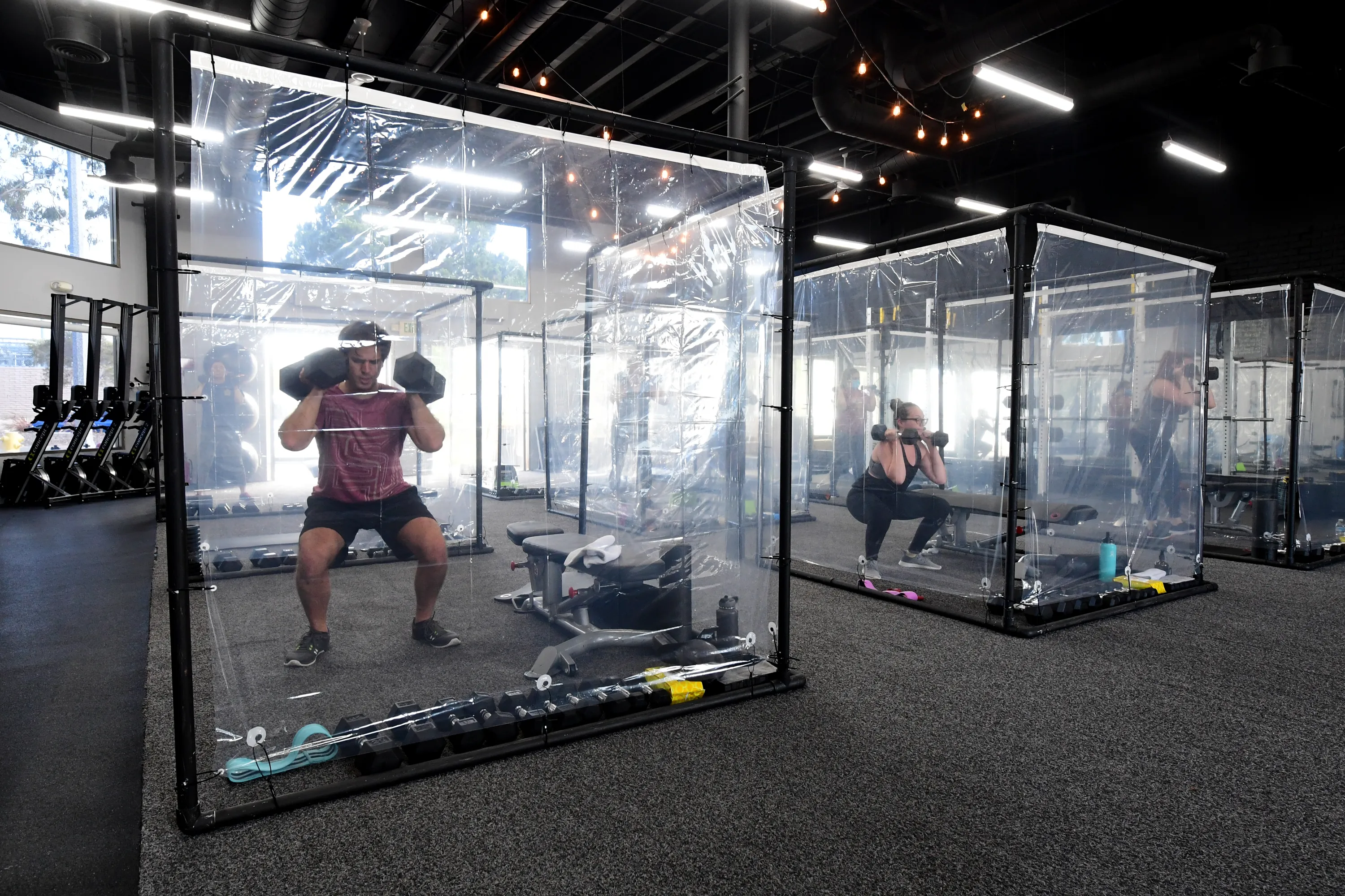 People exercise at Inspire South Bay Fitness behind plastic sheets in their workout pods while observing social distancing on June 15, 2020 in Redondo Beach, California, as the gym reopens today under California's coronavirus Phase 3 reopening guidelines. (Photo by Frederic J. Brown/AFP Photo)