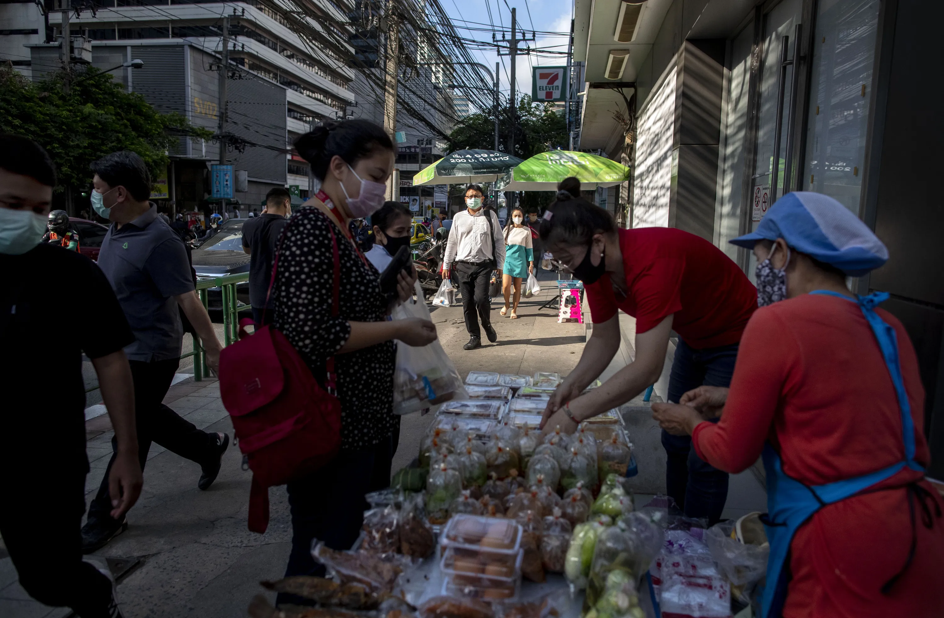 Office workers wearing face masks buy cooked food from street venders in Bangkok, Thailand, Wednesday, May 13, 2020. (Photo by Gemunu Amarasinghe/AP Photo)