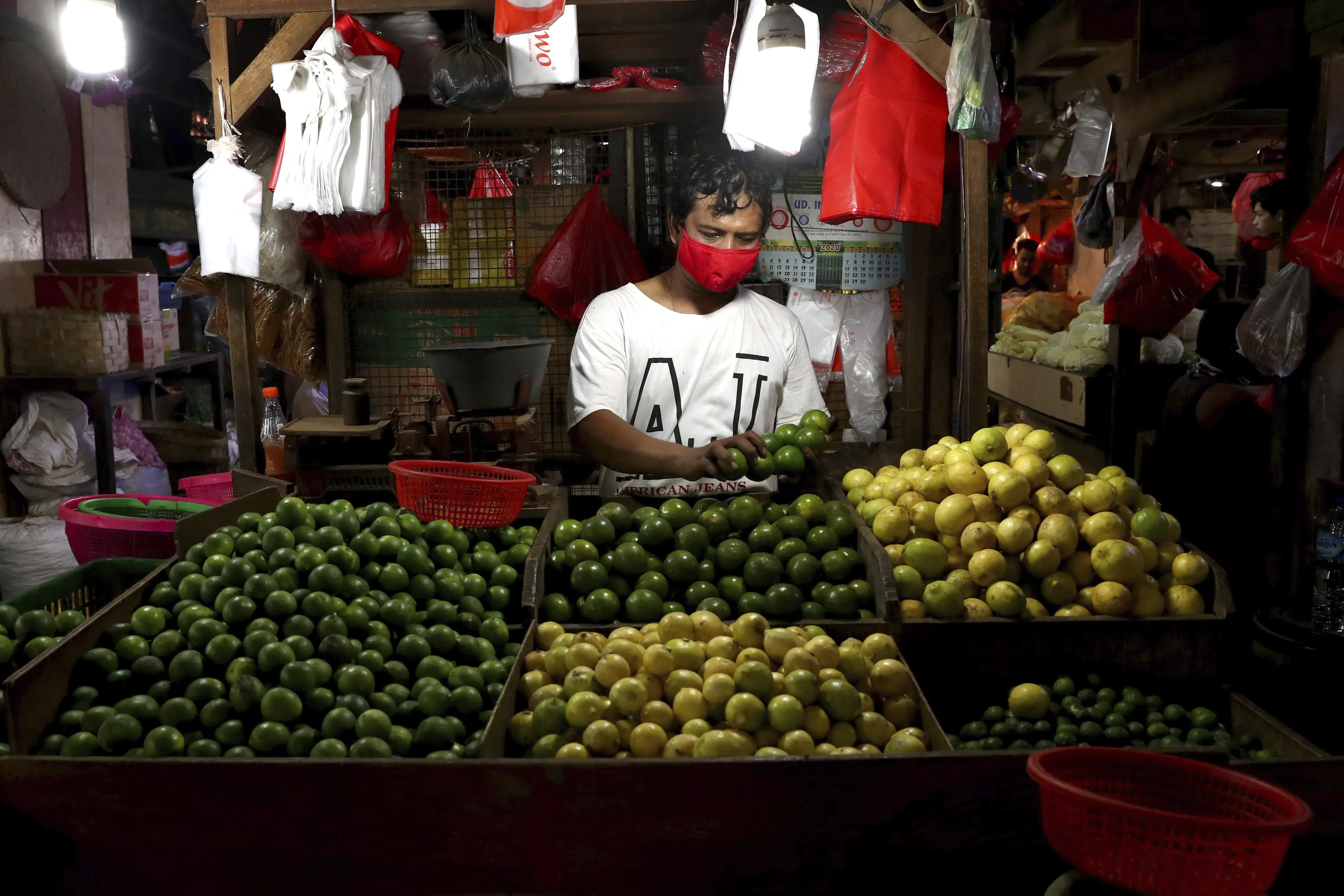 A fruit vendor wears a face mask as a precaution against the new coronavirus at his stall in a traditional market in Jakarta, Indonesia, Tuesday, June 2, 2020. (Photo by Tatan Syuflana/AP Photo)