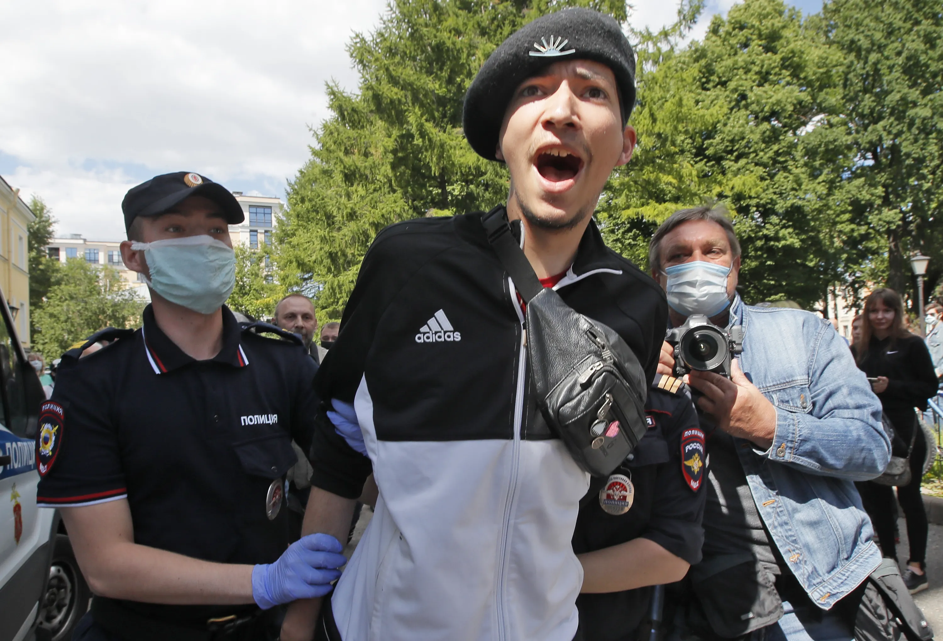 Police detain a man protesting against the court verdict for Yuliy Boyarshinov, and Viktor Filinkov, members of a left-wing group Set (Network) at the Western regional military court in St.Petersburg, Russia, Monday, June 22, 2020. (Photo by Dmitri Lovetsky/AP Photo)
