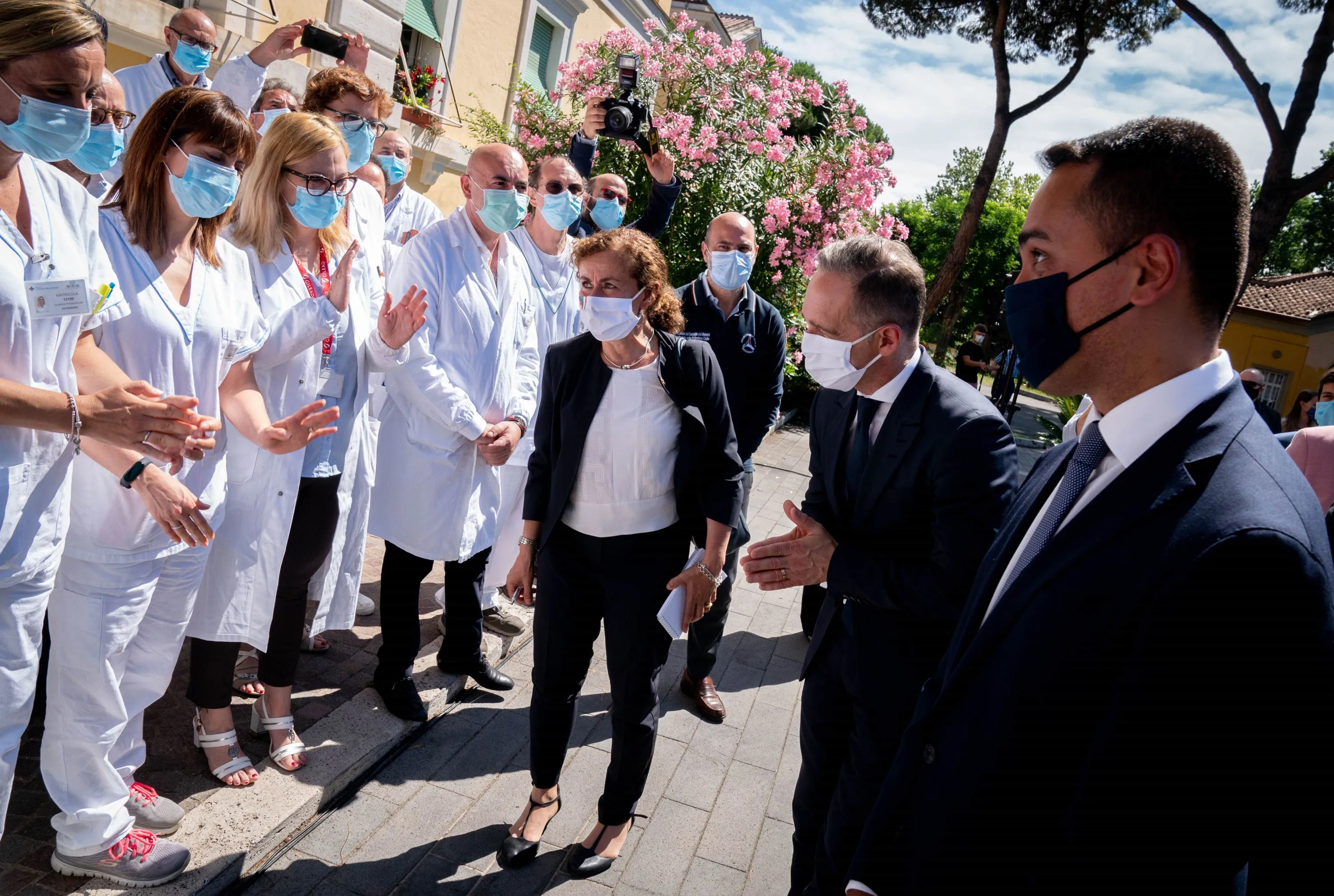 Heiko Maas (2nd from right, SPD), Foreign Minister of Germany, bows to researchers, physicians and nursing staff alongside his Italian counterpart Luigi di Maio (r) during his visit to the Spallanzani Medical Research Centre – IMMI Lazzaro in Rom, Italy on June 22, 2020. (Photo by Kay Nietfeld/picture alliance via Getty Images)
