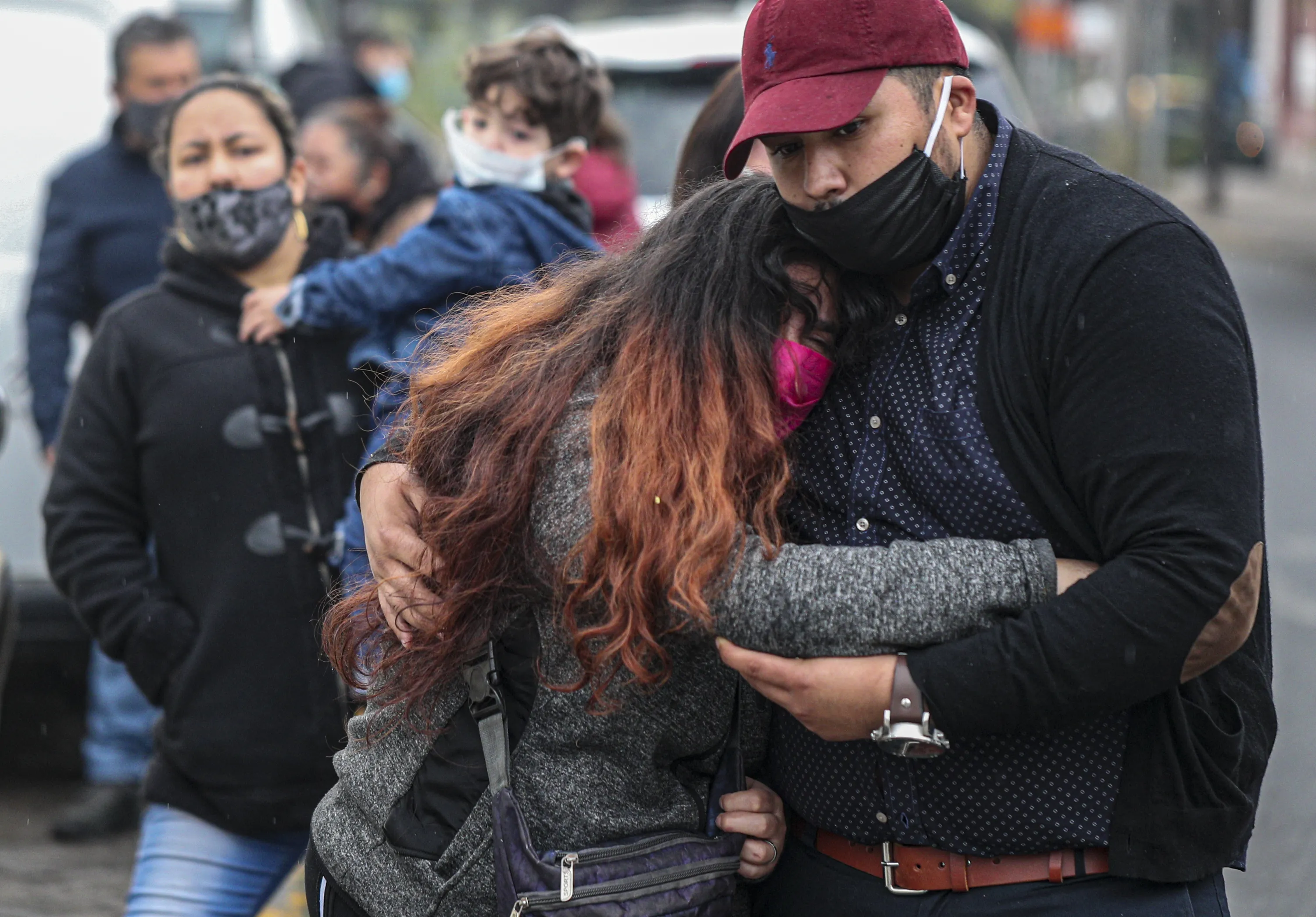 Relatives of Patricio Riveros mourn after his body was brought out in a hearse at the San Jose hospital in Santiago, Chile, Monday, June 22, 2020. Patricio Riveros' son Pedro said that his father died from COVID-19 related complications. (Photo by Esteban Felix/AP Photo)