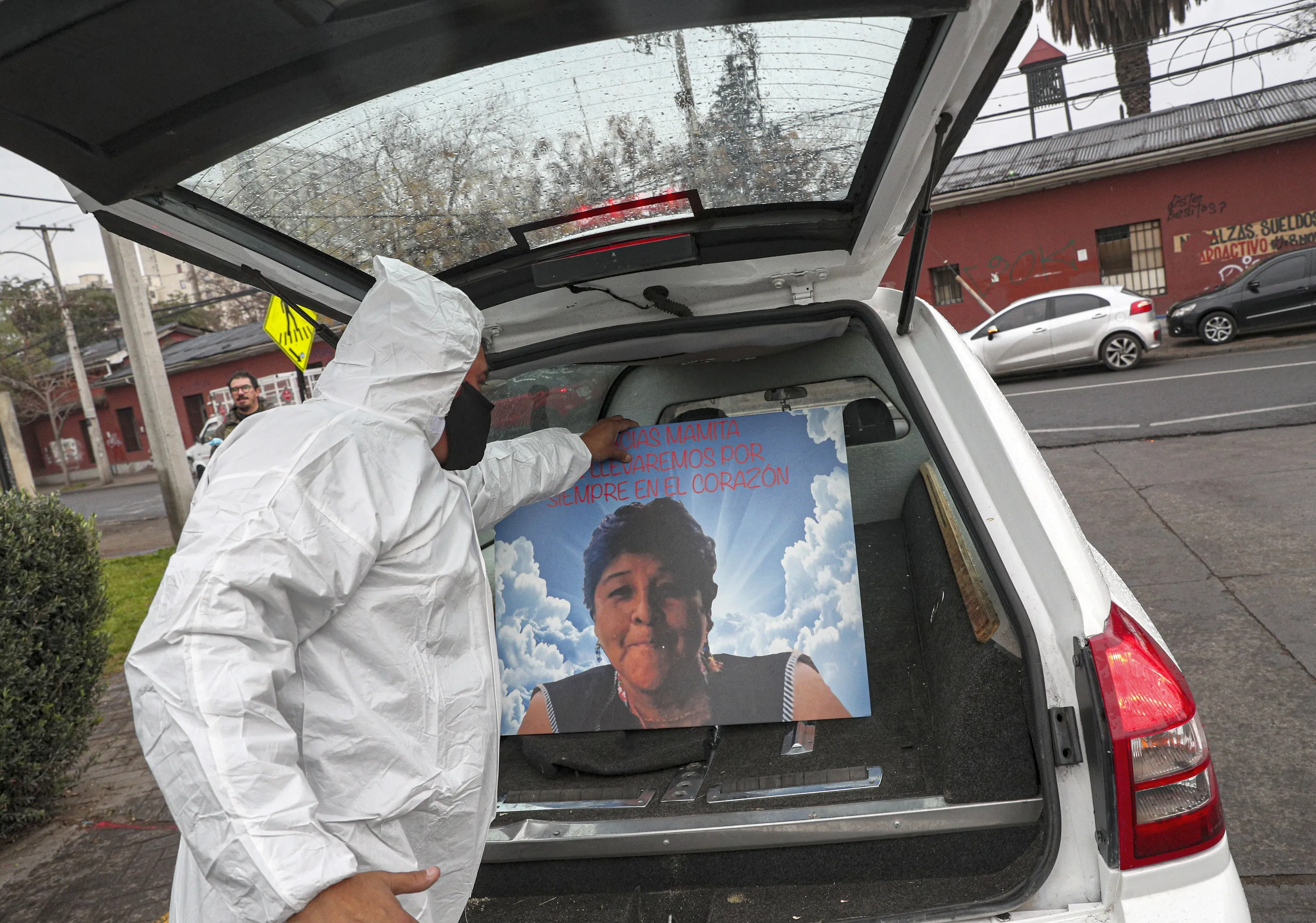 A funeral worker places a picture of Lidia Morales over her coffin in a hearse at the San Jose hospital in Santiago, Chile, Monday, June 22, 2020. Lidia Morales' son Cristian said that his mother died from COVID-19 related complications. (Photo by Esteban Felix/AP Photo)