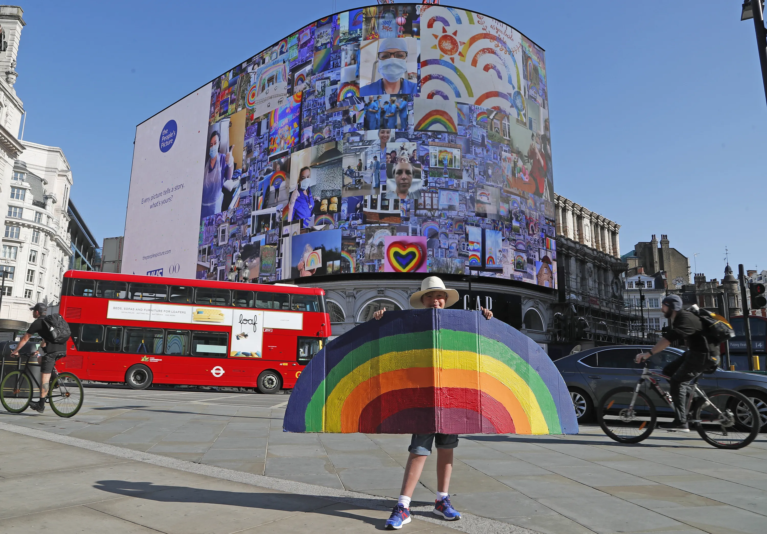 A young boy holds a painted rainbow as pictures appear on a screen during a 10 minute domination on The Piccadilly Lights, Piccadilly Circus, to mark the launch of The People's Picture interactive mosaic art project Rainbows for the NHS in London, Monday, June 22, 2020. The art installation which features thousands of photos and messages from key workers, carers, patients, doctors and nurses appears on Piccadilly Lights until June 28. (Photo by Frank Augstein/AP Photo)