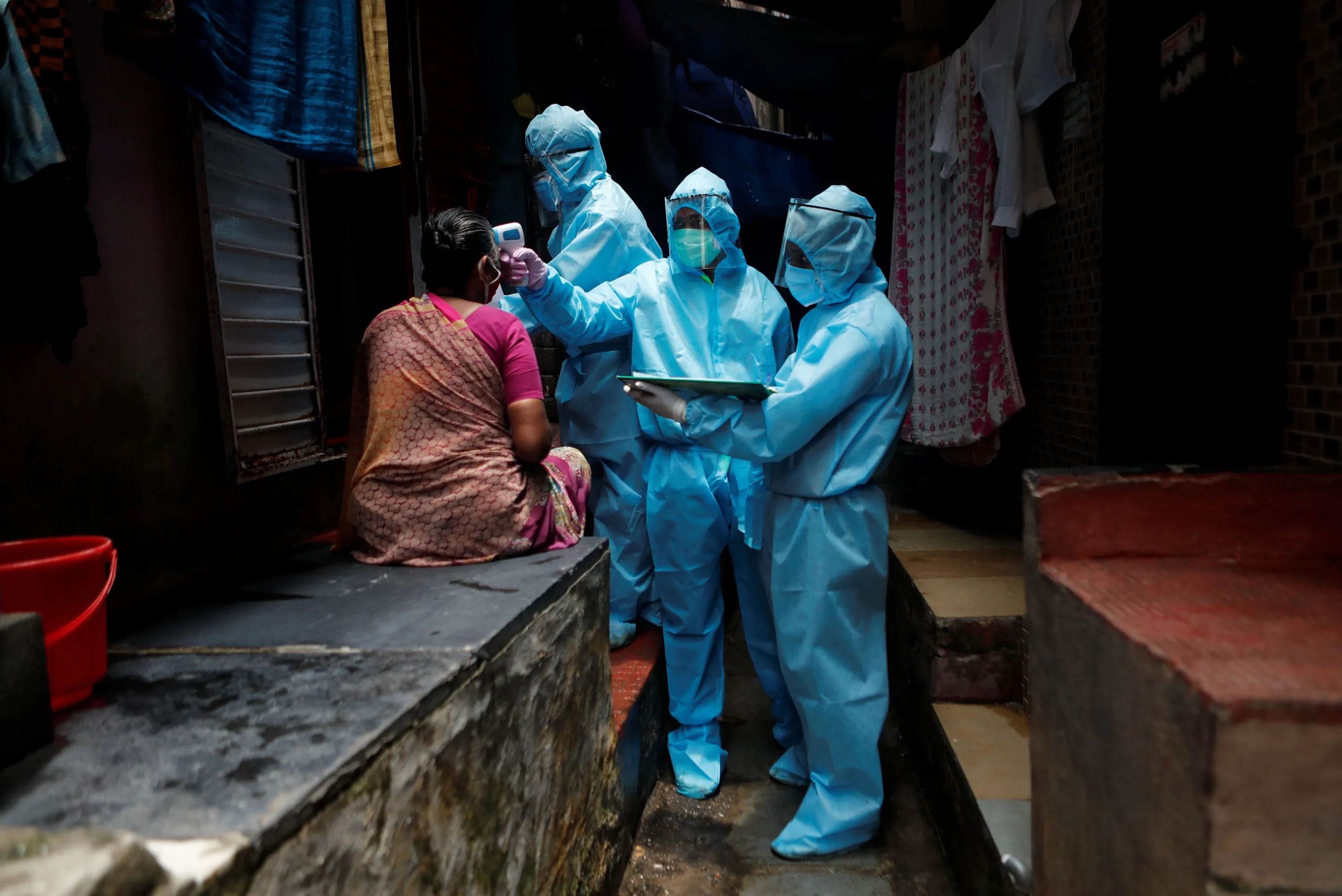 Healthcare workers wearing personal protective equipment (PPE) check the temperature of a resident at a slum during a check-up camp for the coronavirus disease (COVID-19) in Mumbai, India June 14, 2020. (Photo by Francis Mascarenhas/Reuters)