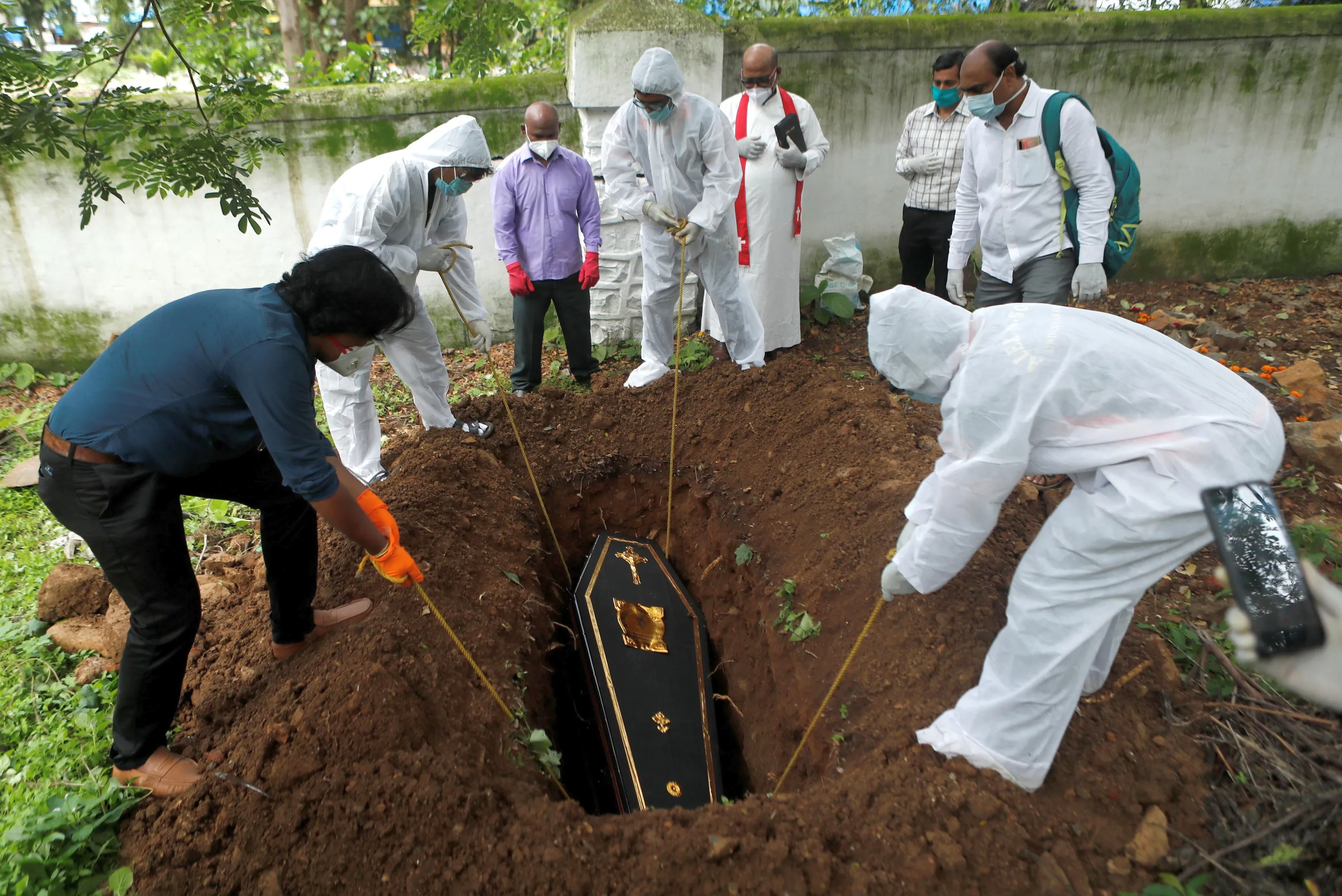 People lower the coffin of a victim who died from the coronavirus disease into a grave at a cemetery as a priest and relative watch, during a funeral in Mumbai, India, June 23, 2020. (Photo by Francis Mascarenhas/Reuters)