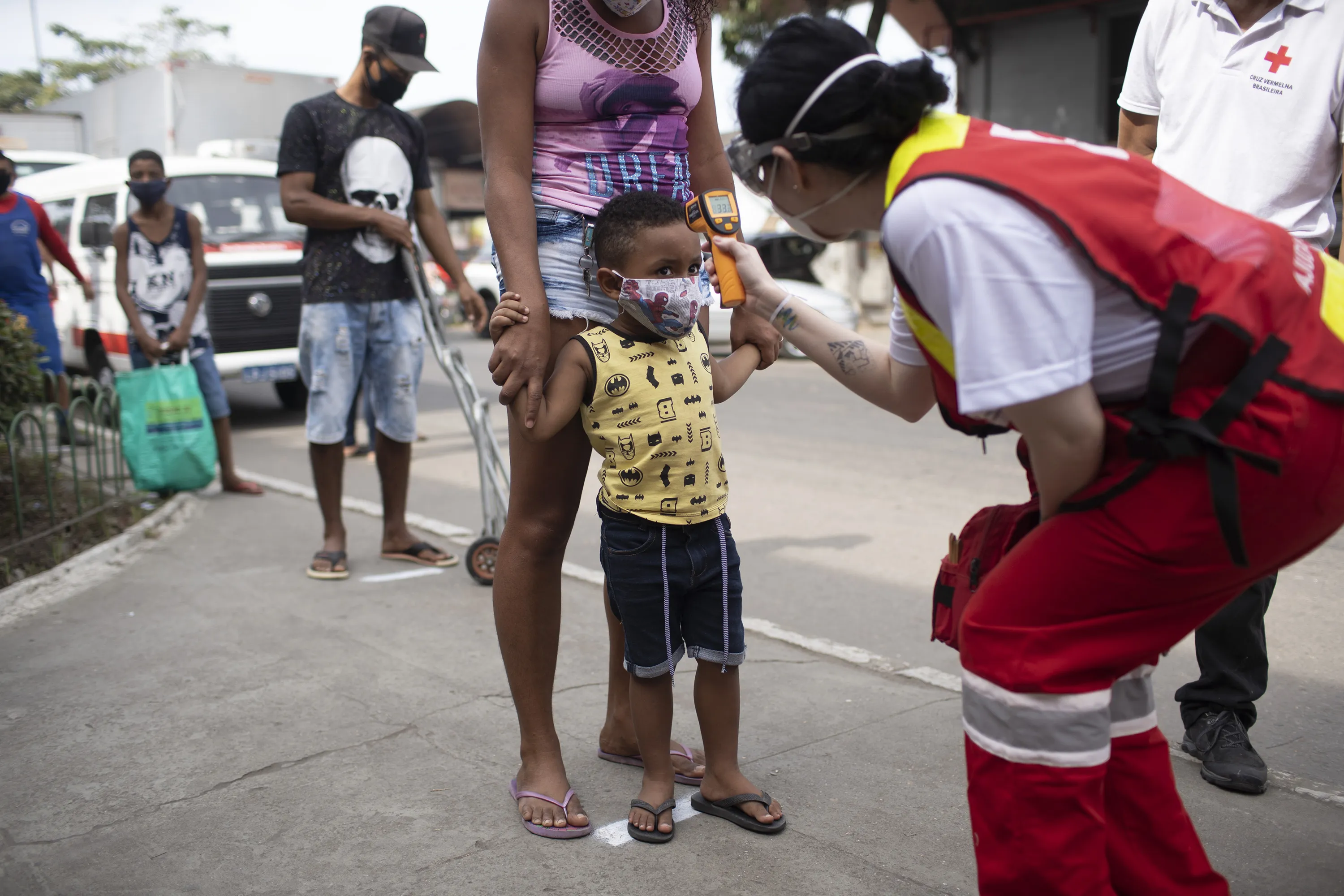 A member of the Red Cross checks the temperature of a child at the CEASA, Rio de Janeiro's main wholesale market, amid the new coronavirus pandemic in Rio de Janeiro, Brazil, Tuesday, June 23, 2020. (Photo by Silvia Izquierdo/AP Photo)