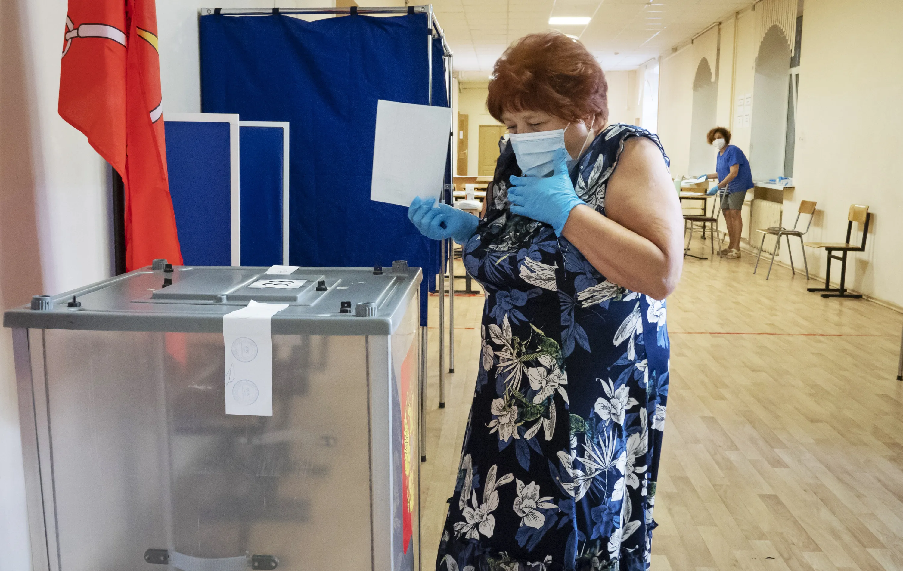 A voter wearing a face mask and protective gloves to protect against coronavirus walks to cast her ballot at a polling station in St.Petersburg, Russia, Thursday, June 25, 2020. Polls have opened in Russia on Thursday for a week-long vote on a constitutional reform that may allow President Vladimir Putin to stay in power until 2036. (Photo by Dmitri Lovetsky/AP Photo)