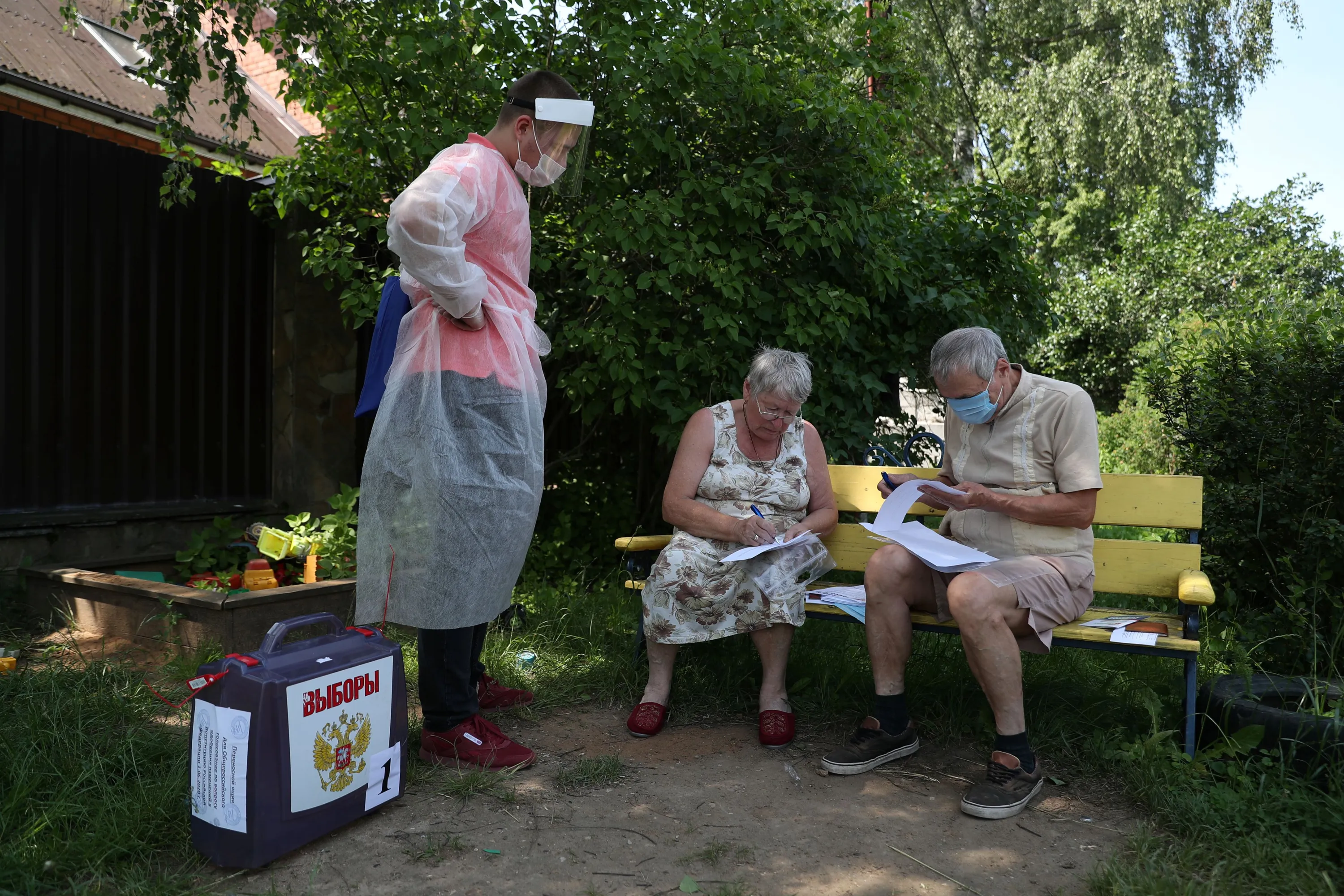 Local residents fill in documents as a member of an electoral commission stands nearby with a mobile ballot box during a seven-day vote on constitutional reforms, in the village of Troitskoye in Moscow region, Russia on June 25, 2020. (Photo by Evgenia Novozhenina/Reuters)