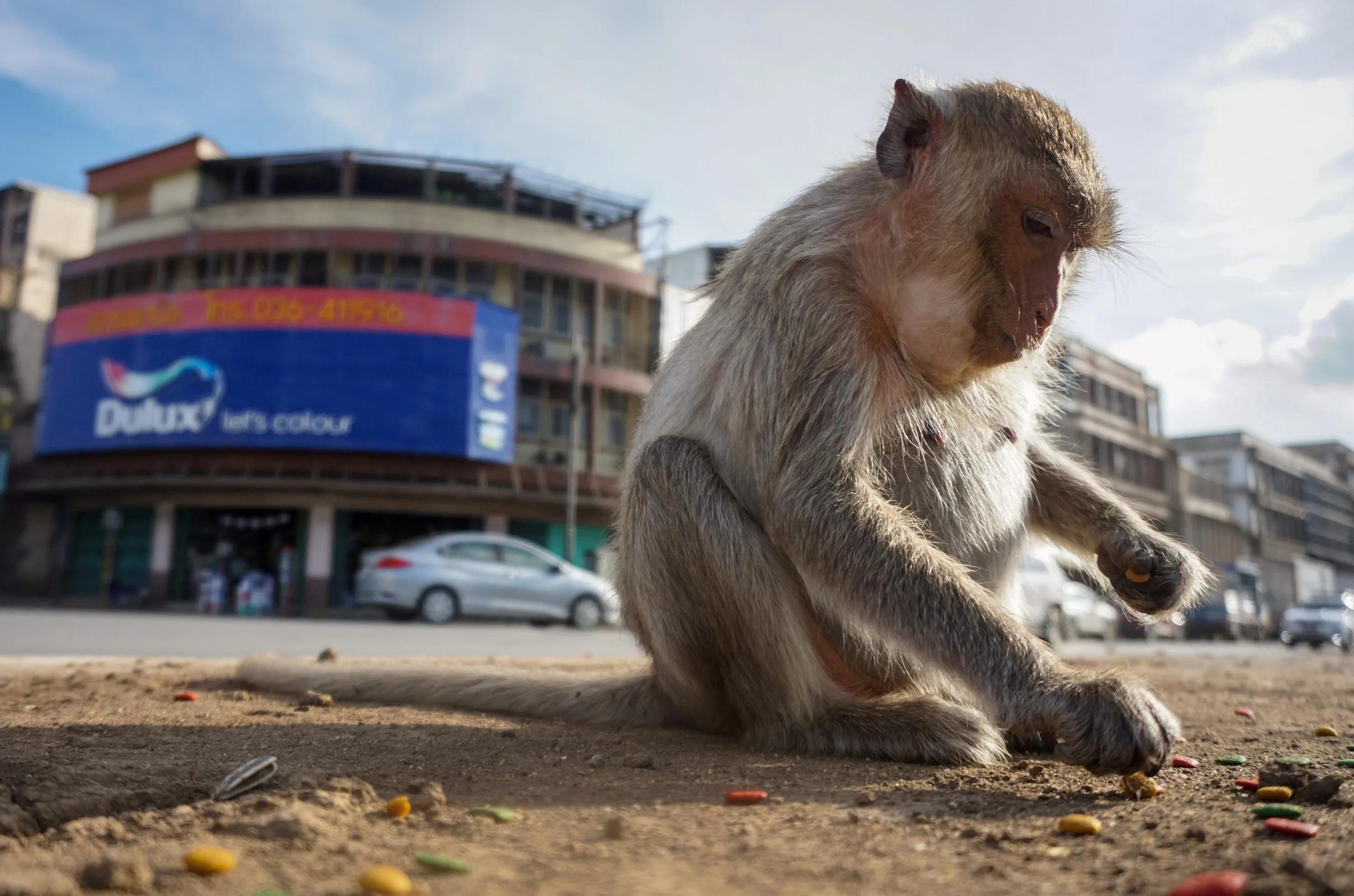 This photograph taken on June 20, 2020 shows a longtail macaque in the town of Lopburi, some 155 km north of Bangkok. Residents barricaded indoors, rival gang fights and no-go zones for humans. Welcome to Lopburi, an ancient Thai city overrun by monkeys super-charged on junk food, whose population is growing out of control. (Photo by Mladen Antonov/AFP Photo)