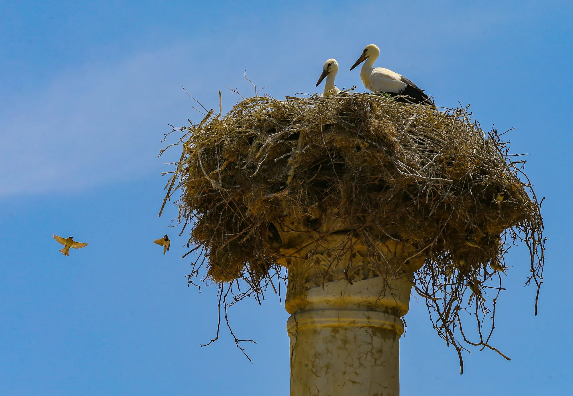 Storks building nest on top of ancient Byzantine column at Liman Street in front of the ancient theatre, are seen at Ephesus Ancient City, listed in the UNESCO's World Heritage List, in Izmir, Turkey on June 10, 2020. (Photo by Mehmet Emin Menguarslan/Anadolu Agency via Getty Images)