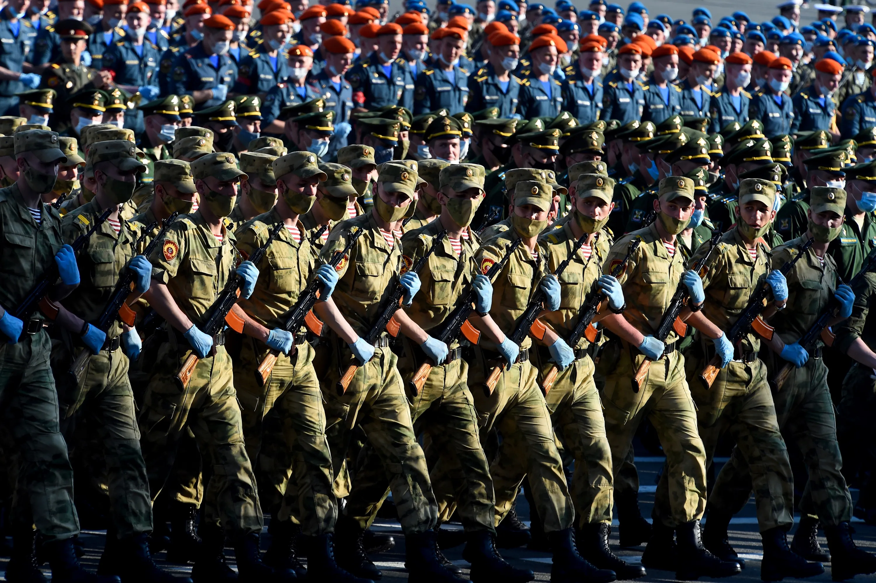 Russian military cadets and servicemen wearing face masks and gloves take part in a rehearsal for June 24 military parade marking Soviet victory in World War II, which was postponed due to the coronavirus pandemic, at Dvortsovaya Square in Saint Petersburg on June 17, 2020. (Photo by Olga Maltseva/AFP Photo)
