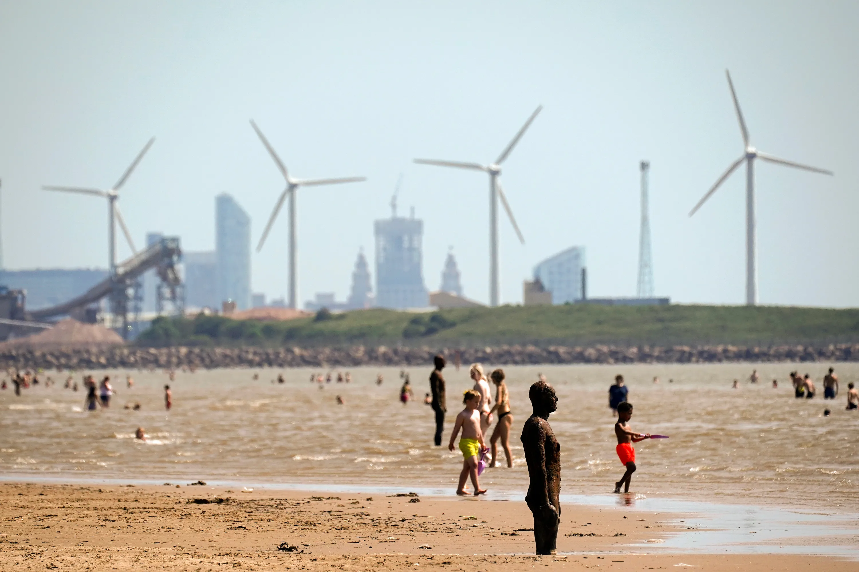People enjoy the warm weather on Crosby Beach on June 25, 2020 in Liverpool, United Kingdom. The UK is experiencing a summer heatwave, with temperatures in many parts of the country expected to rise above 30C and weather warnings in place for thunderstorms at the end of the week. (Photo by Christopher Furlong/Getty Images)