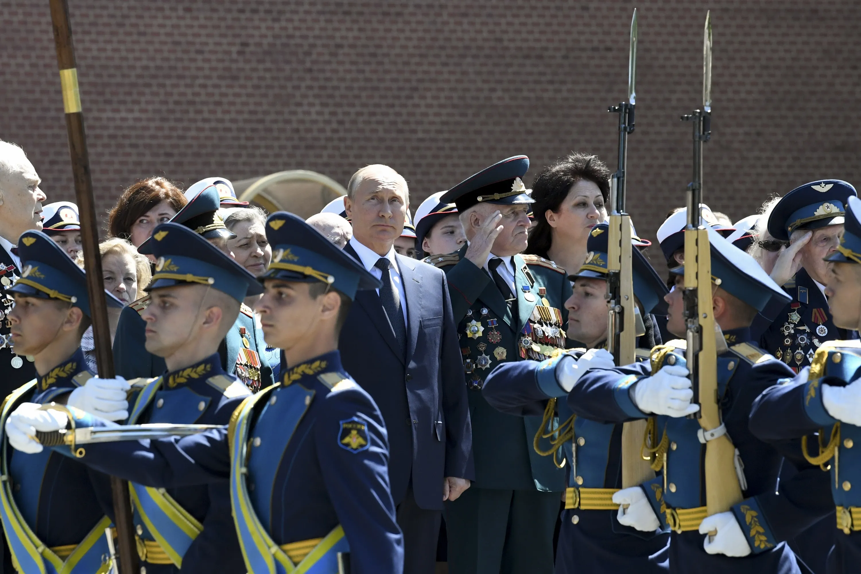 Russian President Vladimir Putin, center, takes part in a wreath laying ceremony at the Tomb of Unknown Soldier in Moscow, Russia, Monday, June 22, 2020, marking the 79th anniversary of the Nazi invasion of the Soviet Union. (Photo by Alexei Nikolsky, Sputnik, Kremlin Pool Photo via AP Photo)