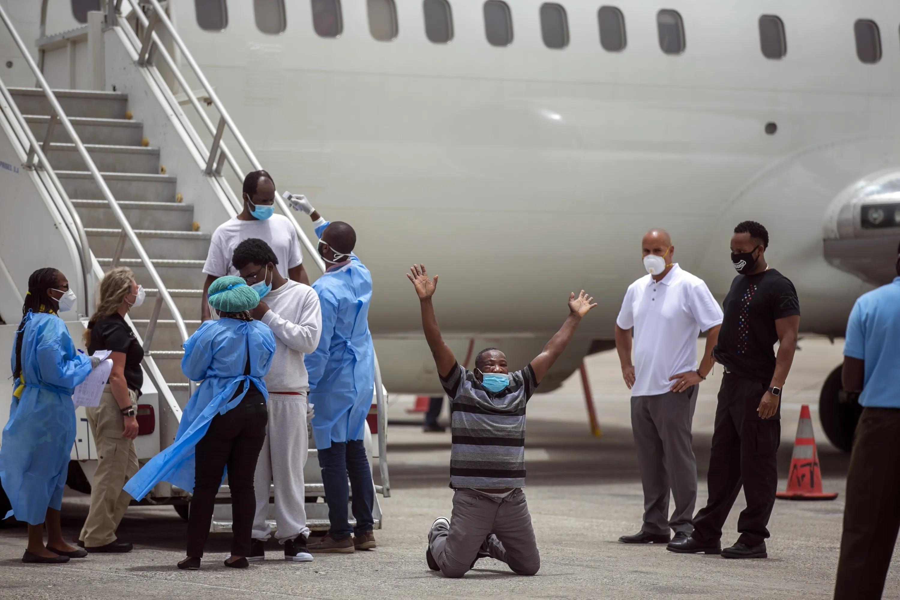 Roland Jean, a Haitian deported from the United States, kneels on the tarmac after arriving at the Toussaint Louverture airport in Port-au-Prince, Haiti, Tuesday, June 23, 2020, The man was transported to a hotel to undergo a 14-day mandated quarantine to prevent the spread of the new coronavirus. (Photo by Dieu Nalio Chery/AP Photo)