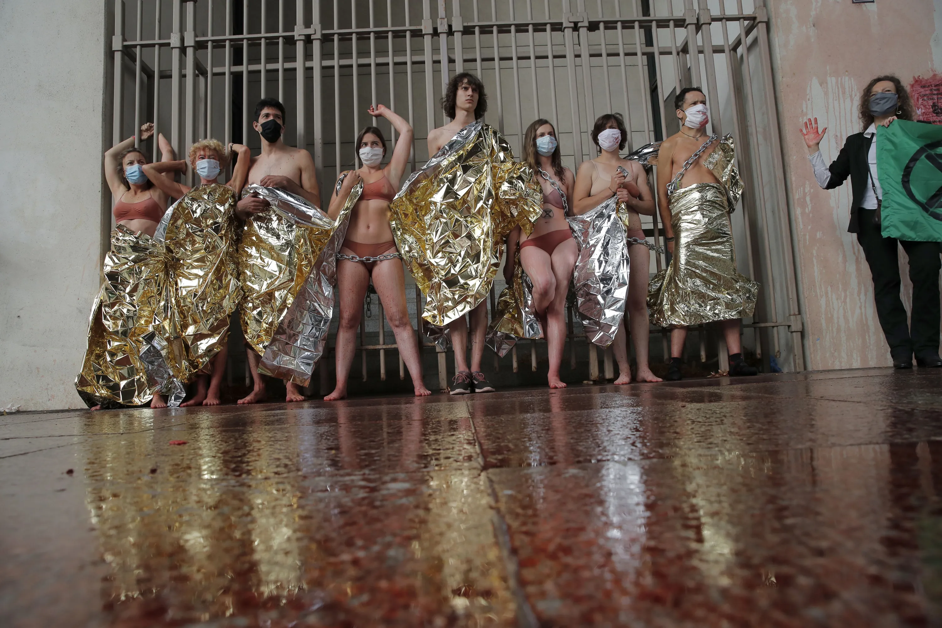 Environment activists of Extinction Rebellion (XR) chain themselves at a fence of the Economy Ministry after pouring fake blood on the ground, Tuesday, June 30, 2020 in Paris. French President Emmanuel Macron is under new pressure to fight climate change after the Green Party did well in Sunday's local elections. (Photo by Christophe Ena/AP Photo)