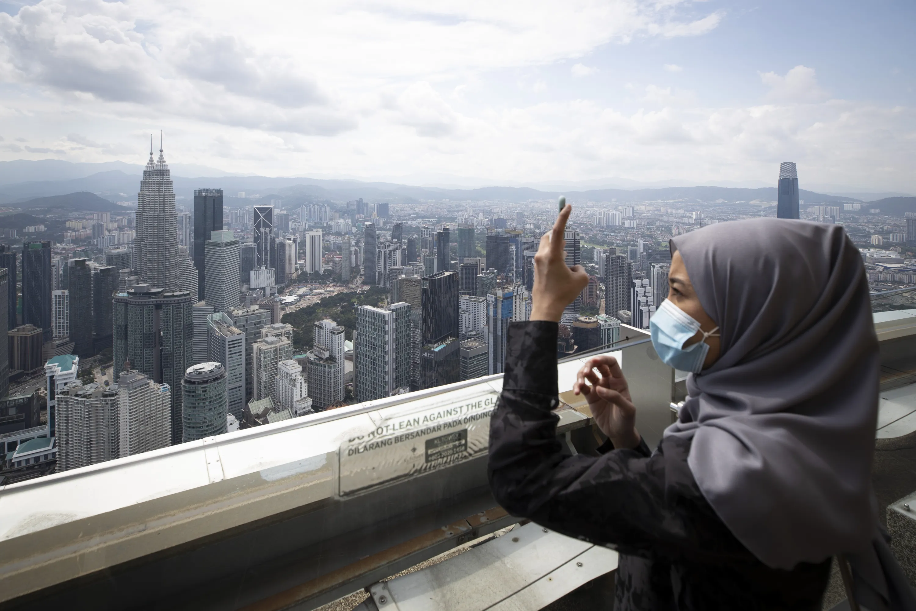 Tourist wearing a face mask takes picture at observation deck at Kuala Lumpur Tower in Kuala Lumpur, Malaysia, Wednesday, July 1, 2020. Malaysia entered the Recovery Movement Control Order (RMCO) after three months of coronavirus restrictions. (Photo by Vincent Thian/AP Photo)