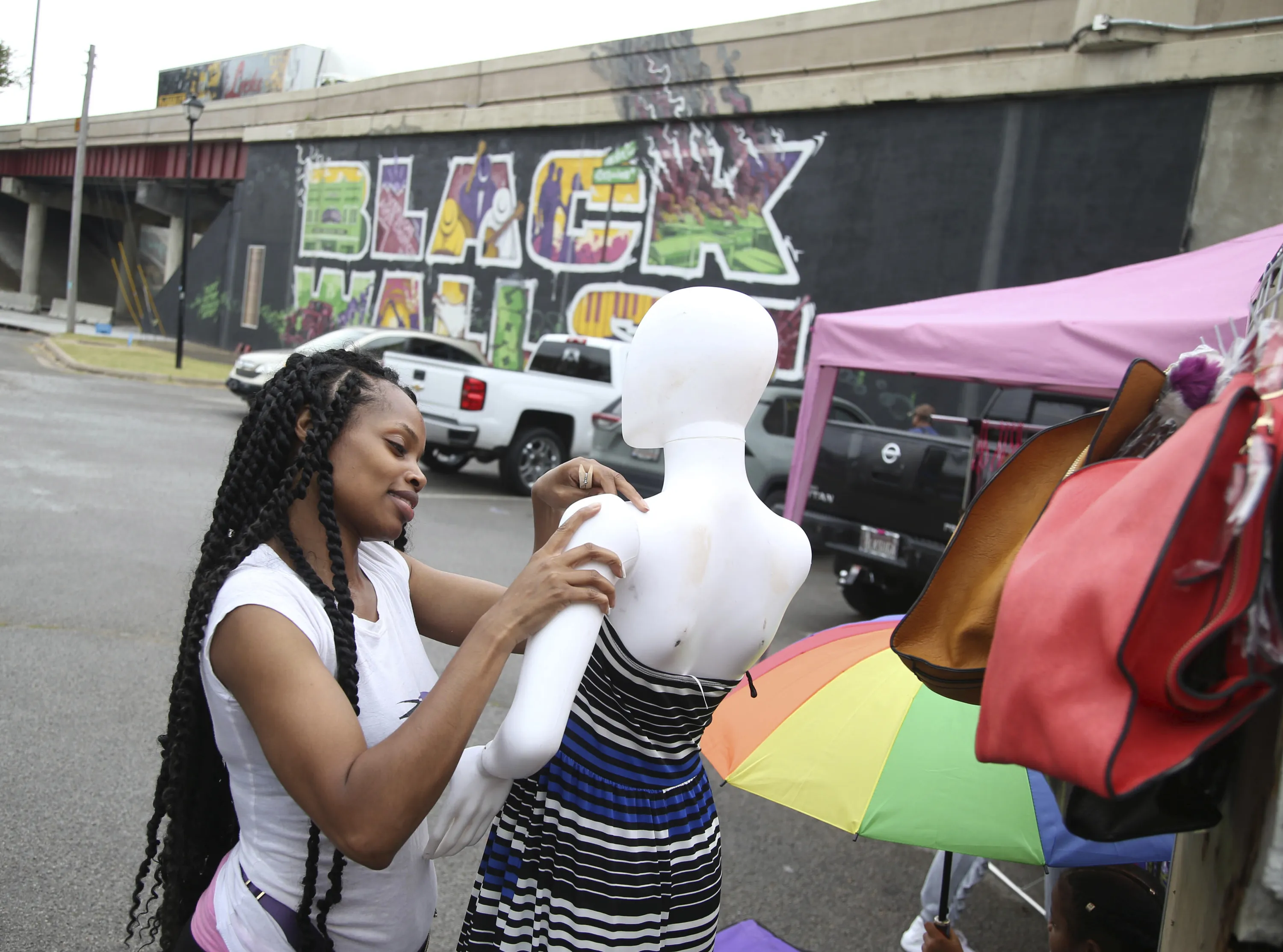 Demetria Jackson, from Kansas City, Kan,, sets out merchandise ahead of a Juneteenth celebration in the Greenwood District in Tulsa, Okla., on Friday, June 19, 2020. Friday marks Juneteenth, the day in 1865 when federal troops arrived in Galveston, Texas, to take control of the state and ensure all enslaved people be freed more than two years after the Emancipation Proclamation. (Photo by Matt Barnard/Tulsa World via AP Photo)
