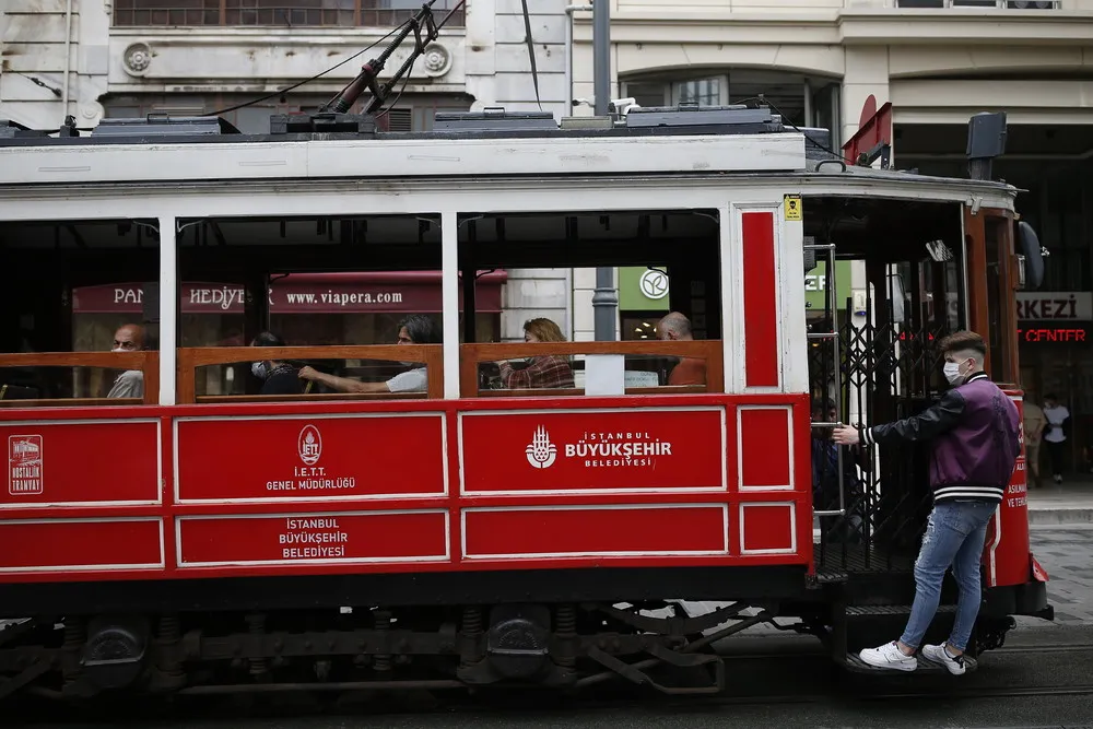 People, wearing protective masks against the spread of coronavirus, use the tram on Istiklal street, the main shopping street in Istanbul, Thursday, June 18, 2020. (Photo by Emrah Gurel/AP Photo)
