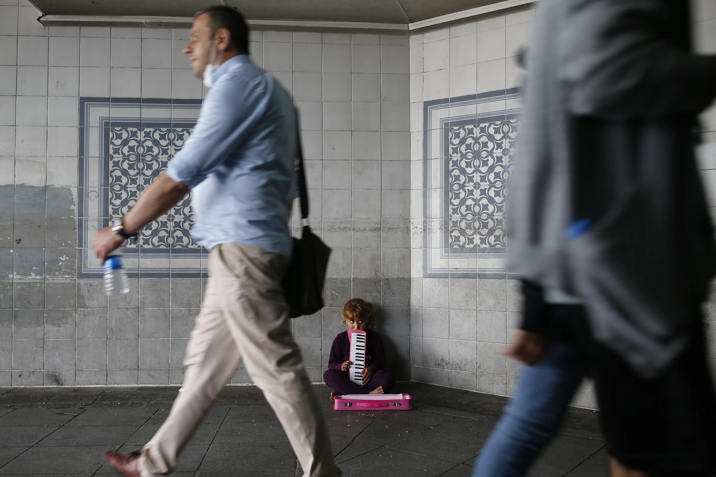 People, some wearing protective masks against the spread of coronavirus, walk by a child playing music for money on an underpass in Istanbul, Thursday, June 18, 2020. (Photo by Emrah Gurel/AP Photo)