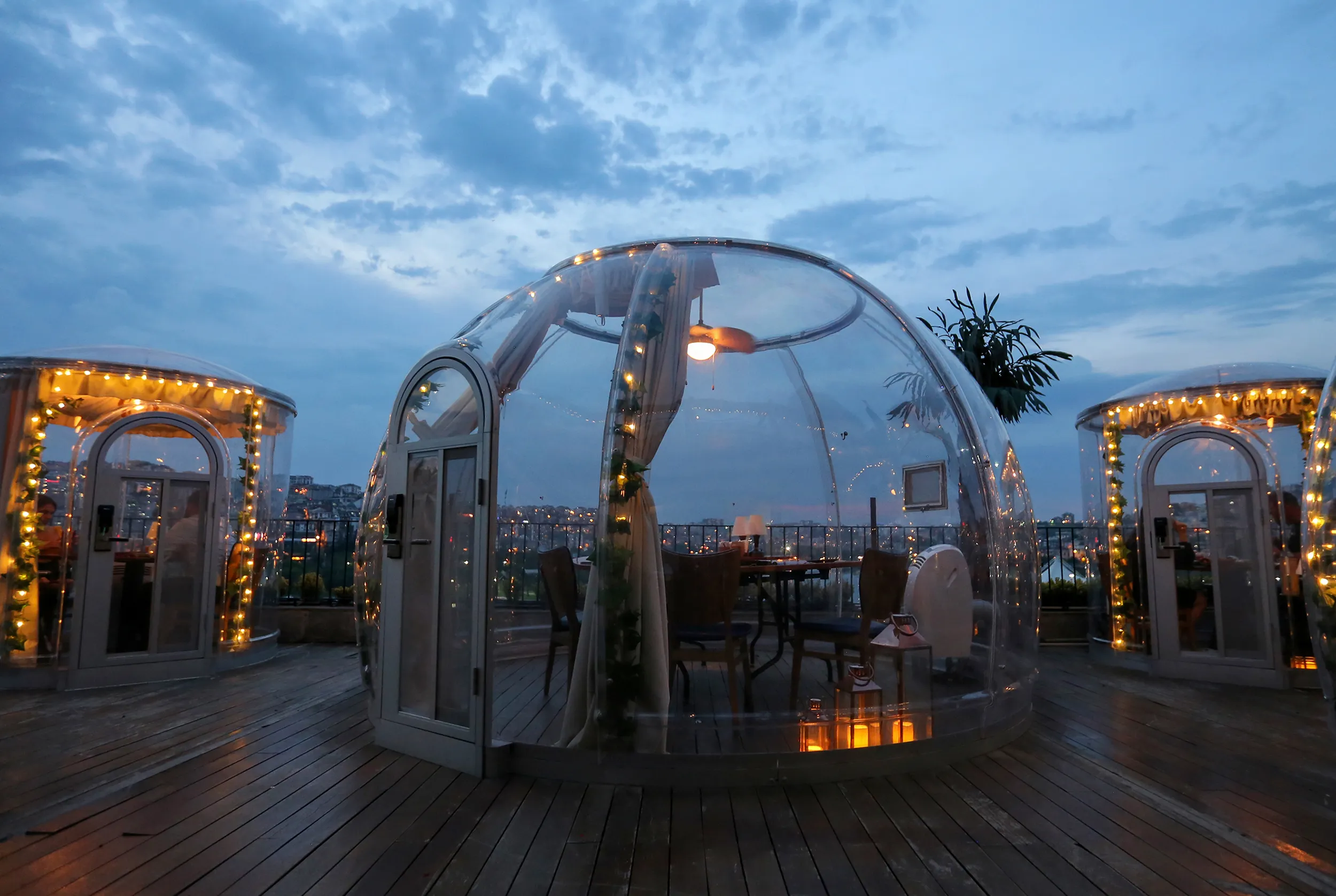 Isolated eating areas in the shape of “dome” as a measure against coronavirus (COVID-19) pandemic, are seen at a restaurant with Halic view in Istanbul, Turkey on June 16, 2020. (Photo by Esra Bilgin/Anadolu Agency via Getty Images)