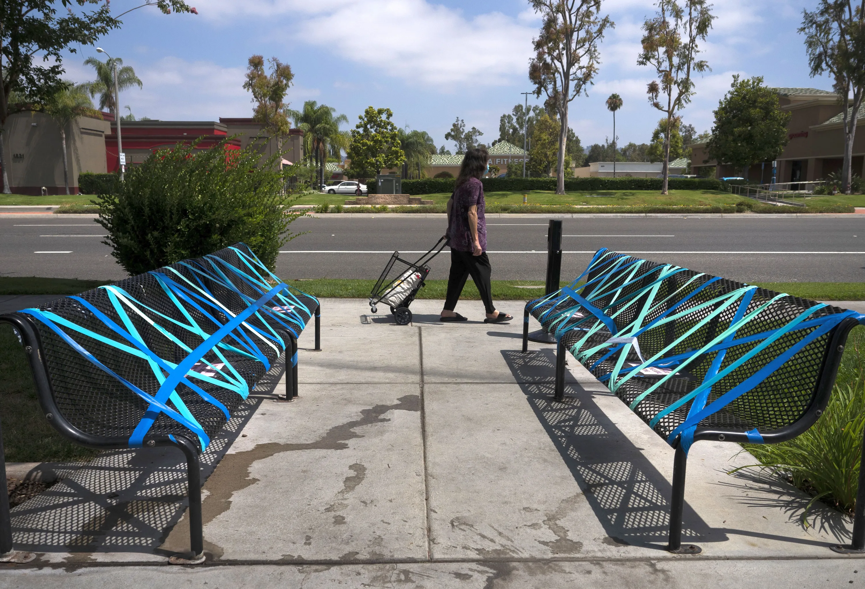 A woman walks past benches taped off for social distancing outside a restaurant, Thursday, July 2, 2020, in La Habra, Calif. California's mood has gone from optimistic to sour as coronavirus cases and hospitalizations are on the rise heading into the July 4th weekend. Gov. Gavin Newsom has ordered bars and indoor restaurant dining closed in most of the state, many beaches are off limits, and he's imploring Californians to avoid holiday gatherings with family and friends. (Photo by Jae C. Hong/AP Photo)