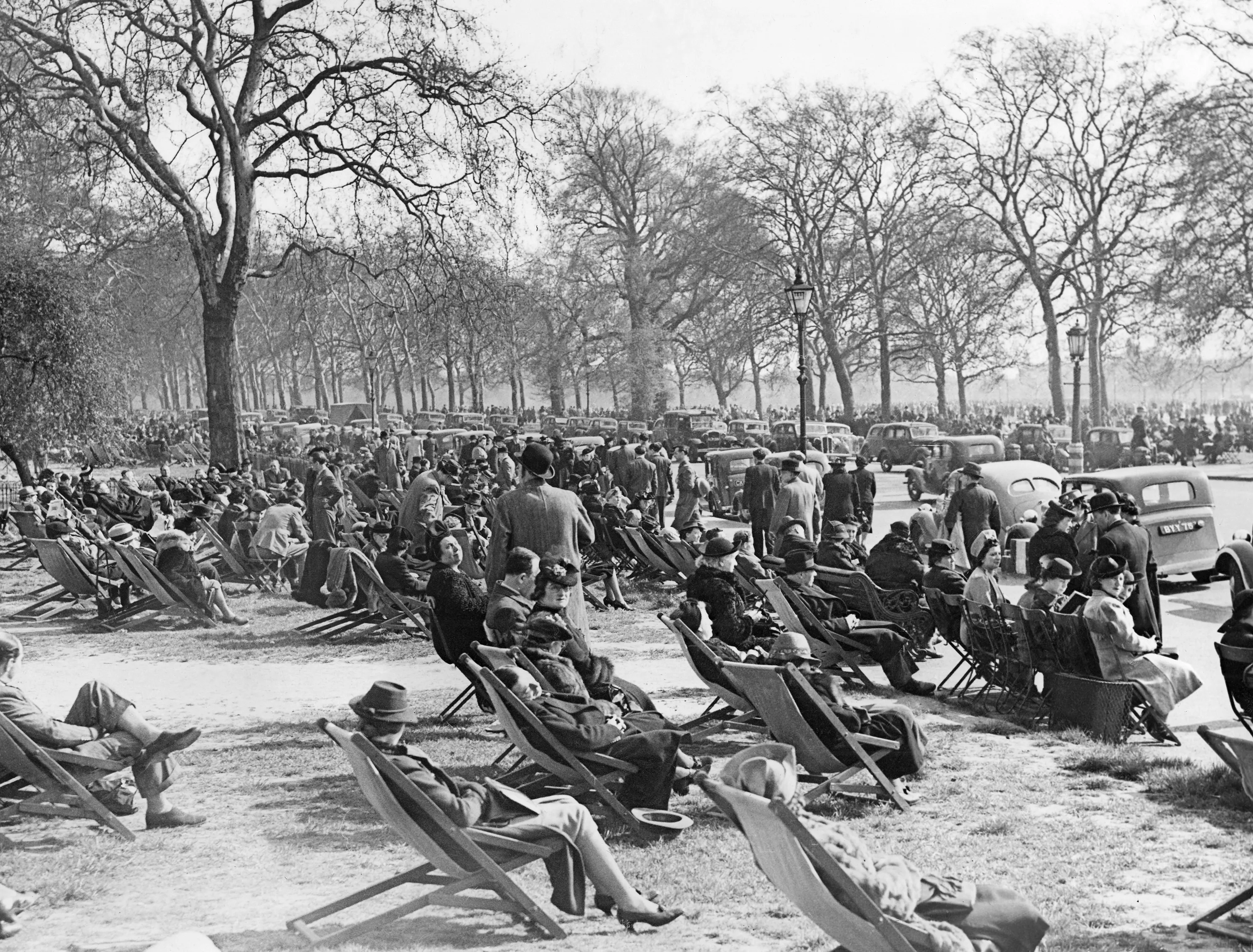 Automobiles line a roadside through Hyde Park, London, on May 4, 1941, the sunshine attracting crowds despite the threat of air raids. This is part of the crowd that caused seat ticket-sellers to report “capacity business”. (Photo by AP Photo)