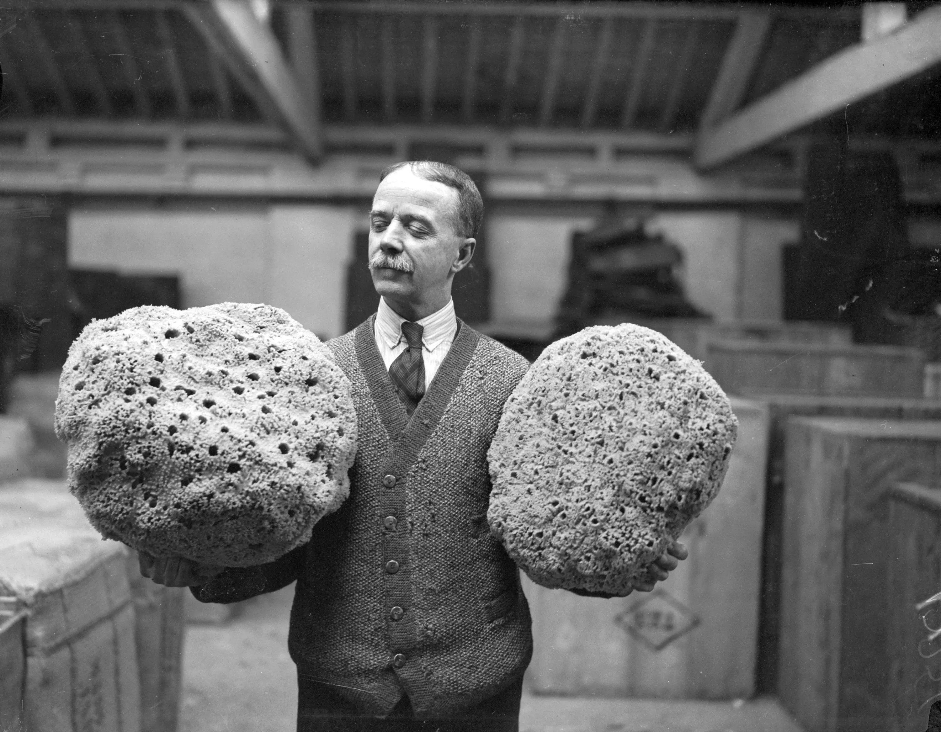 Large honeycombe sponges from the eastern Mediterranean which are going to be on display at a PLA (Port of London Authority) warehouse, 9th March 1933. (Photo by Harry Todd/Fox Photos/Getty Images)