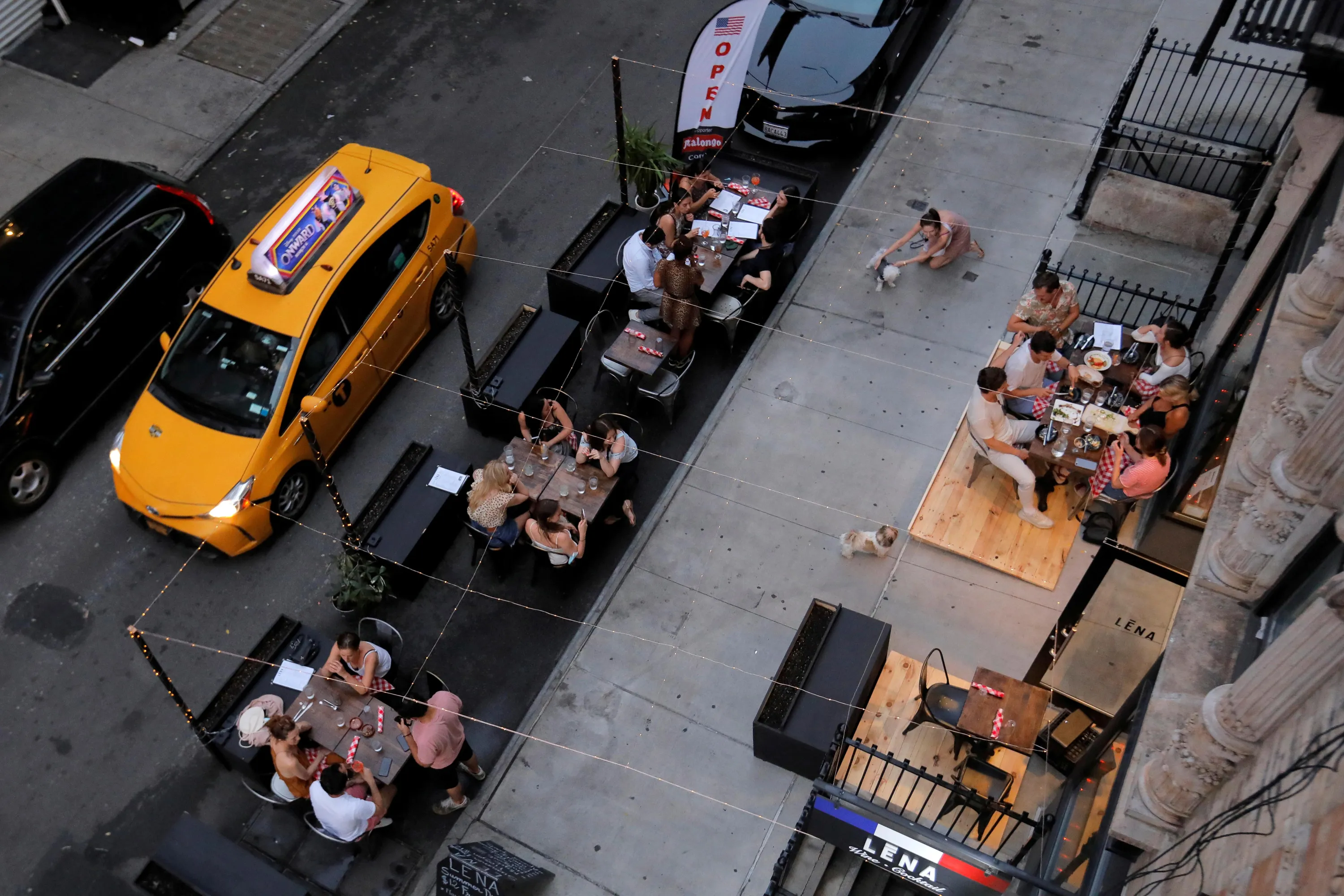 People eat outside of LENA Winebar as restaurants are permitted to offer al fresco dining as part of phase 2 reopening during the coronavirus disease (COVID-19) outbreak in the Lower East Side neighborhood of Manhattan in New York City, U.S., June 27, 2020. (Photo by Andrew Kelly/Reuters)