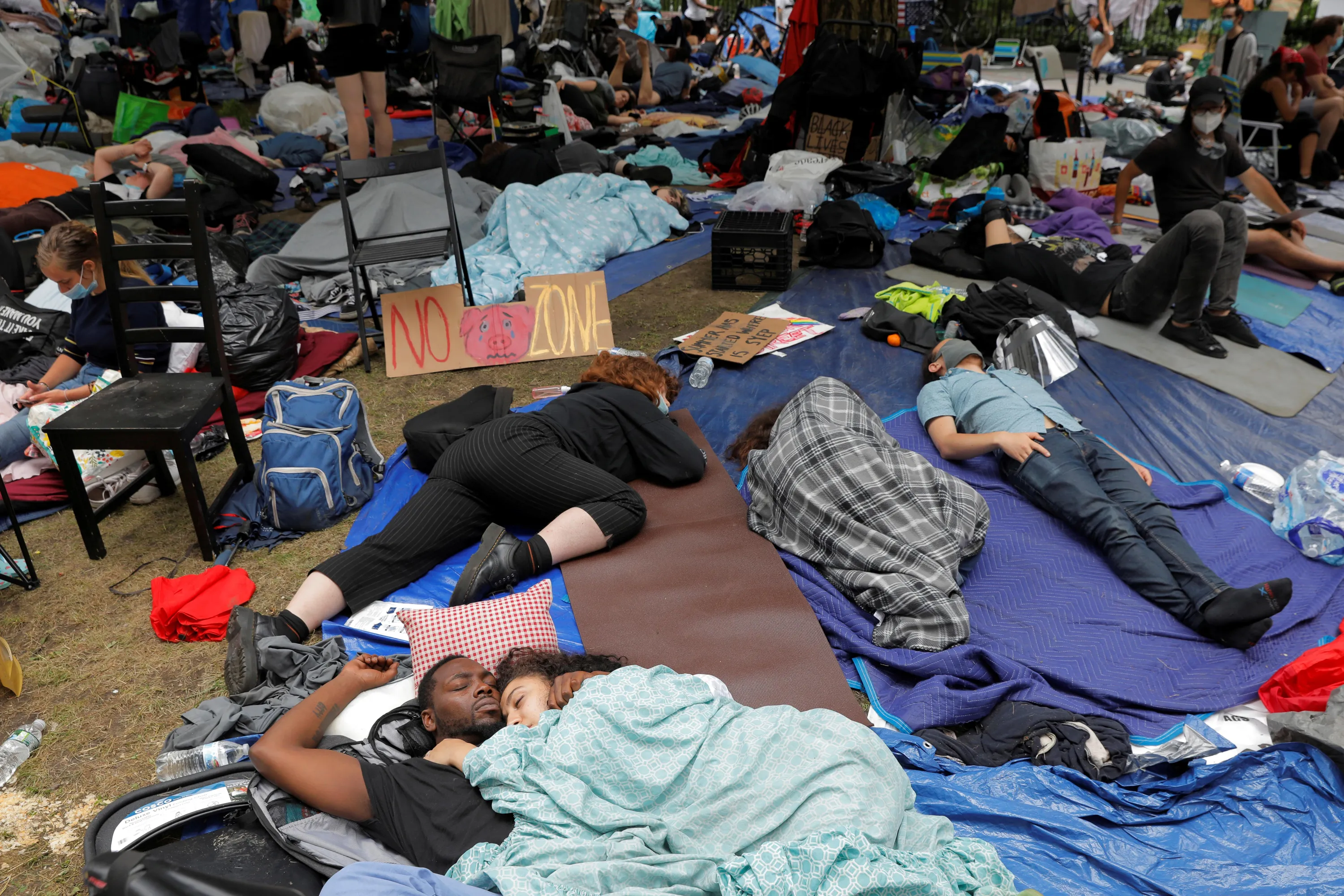 Demonstrators relax inside of an area being called the “City Hall Autonomous Zone” that has been established to protest the New York Police Department and in support of “Black Lives Matter” near City Hall in lower Manhattan, in New York City, U.S., June 30, 2020. (Photo by Lucas Jackson/Reuters)