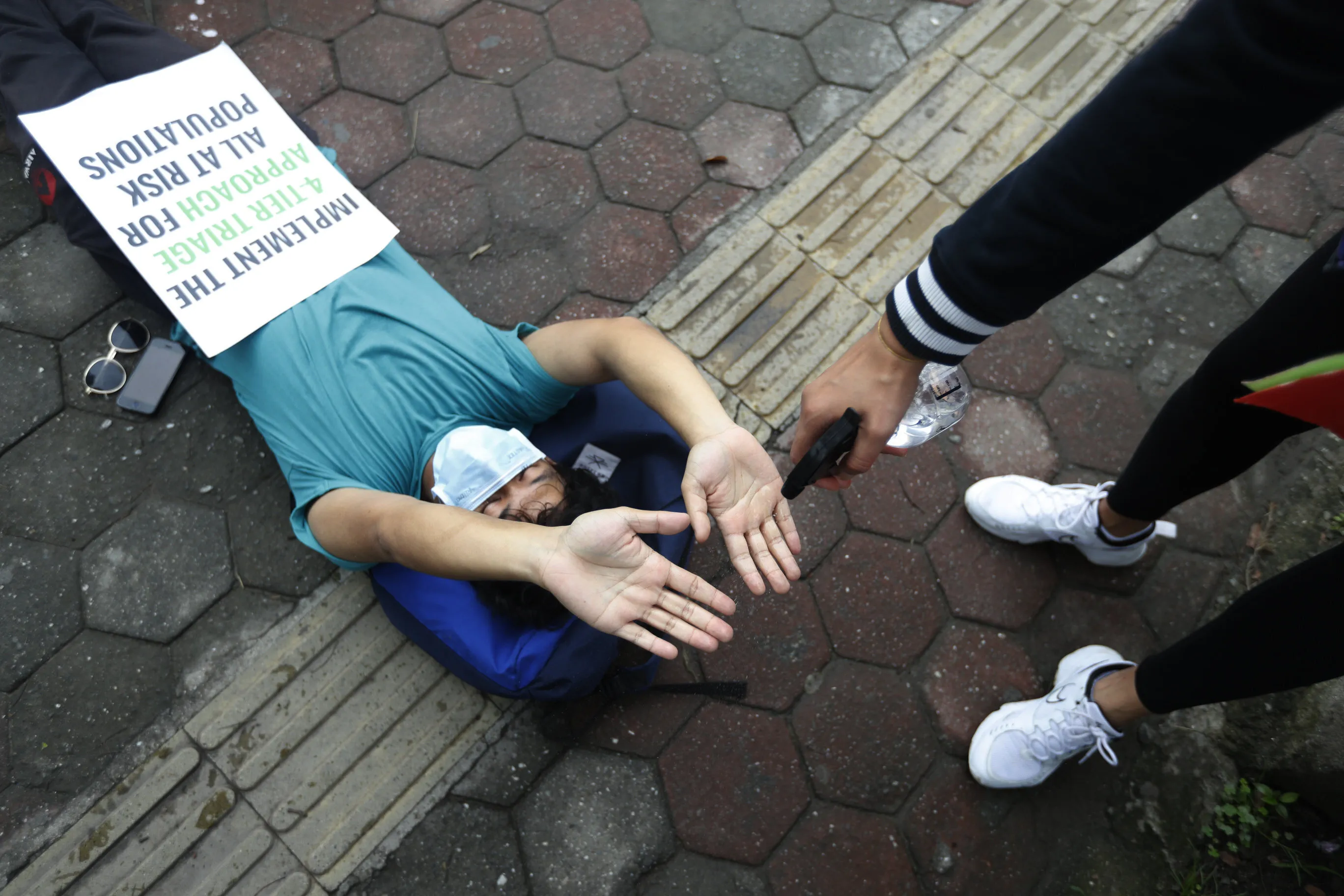 A protester uses a hand sanitizer as he lies on the ground demanding better handling of the COVID-19 pandemic in Kathmandu, Nepal, Saturday, June 20, 2020. Hundreds participated demanding increased testing and protesting alleged corruption by government officials while purchasing equipment and testing kits. (Photo by Niranjan Shrestha/AP Photo)