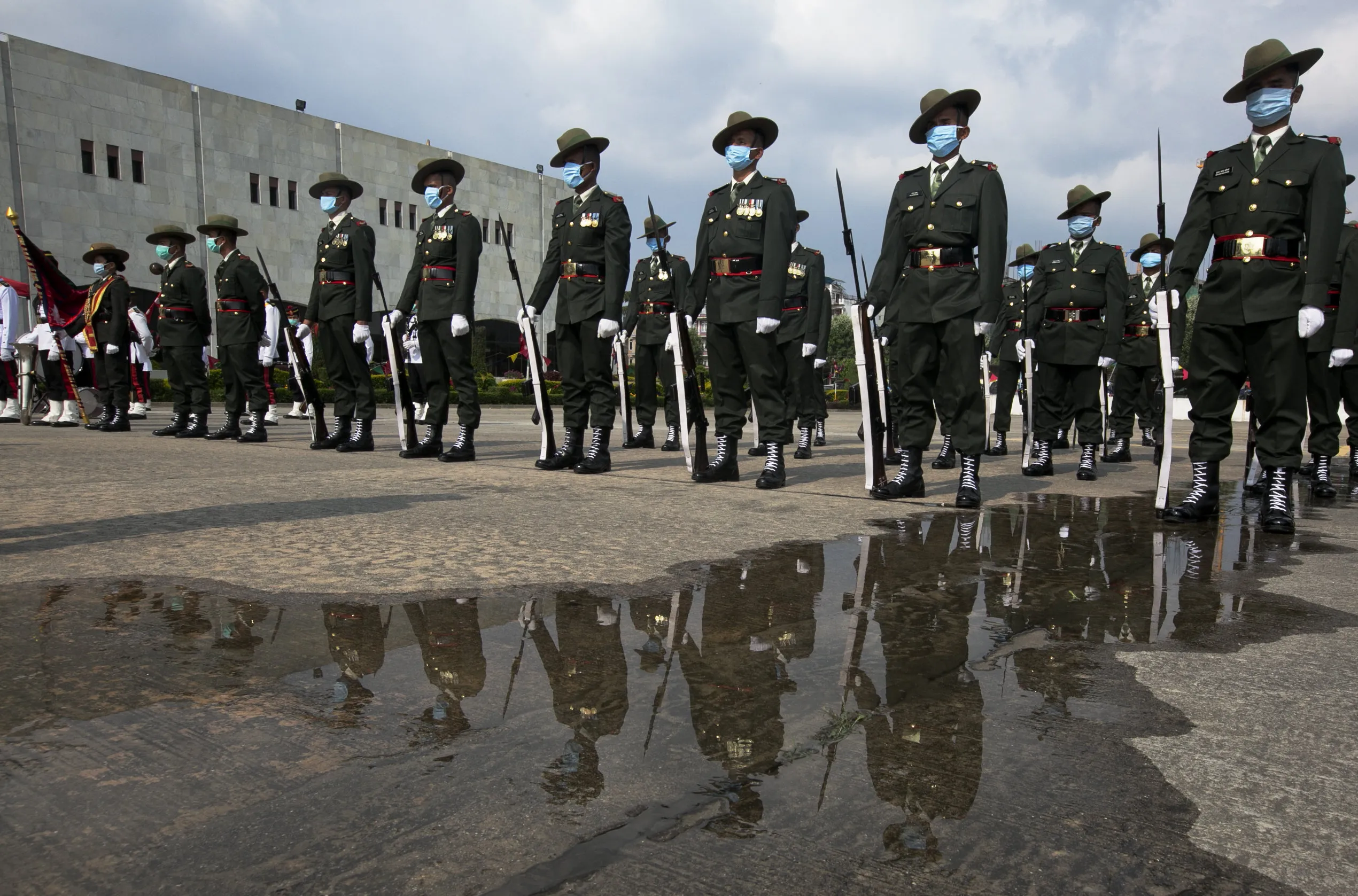 Nepalese army soldiers wearing face masks wait for the president in Kathmandu, Nepal, Friday, May 15, 2020. Nepalese President Bidhya Devi Bhandari presented the government's policies and programs for the upcoming fiscal year on Friday. (Photo by Niranjan Shrestha/AP Photo)