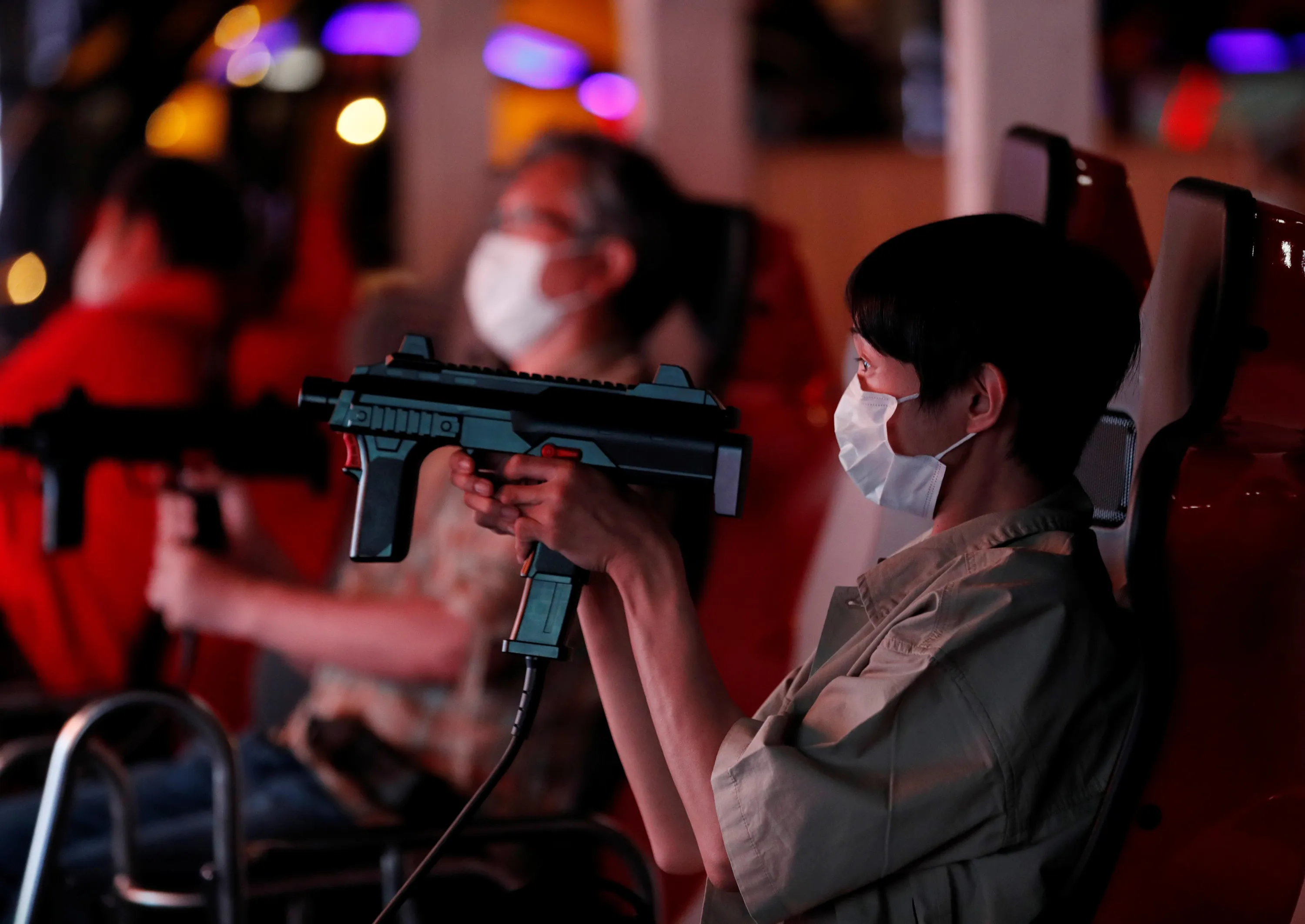 Visitors wearing protective masks play shooting game at an indoor amusement park “Joypolis” which reopened last weekend amid the coronavirus disease (COVID-19) outbreak in Tokyo, Japan on June 16, 2020. (Photo by Kim Kyung-Hoon/Reuters)